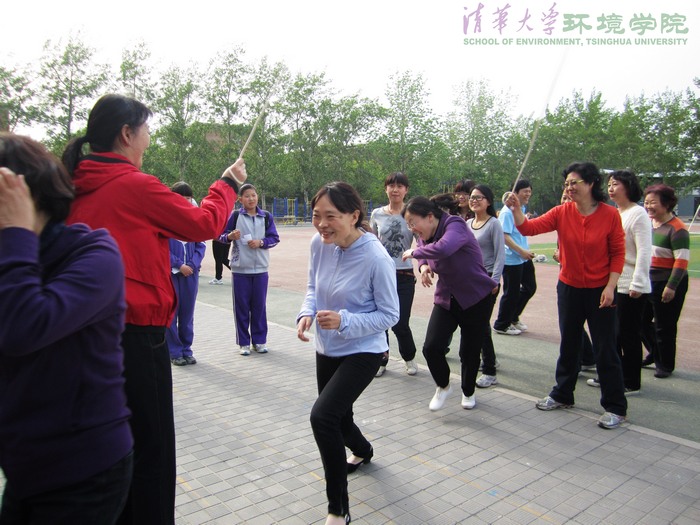 清华环境学院4月27日电 (通讯员 李瑞瑞) 4月26日,为响应清华大学工会号召,环境学院15位教工在工会体育委员李京峰老师的带领下,参加了在清华附小操场举办的第三十九届清华大学教职工运动会跳长绳比赛。按照规则,2人摇绳,12-14人跳绳,时限二分钟,环境学院教工取得了较为理想的成绩。