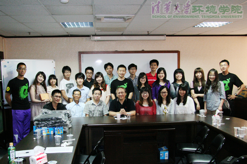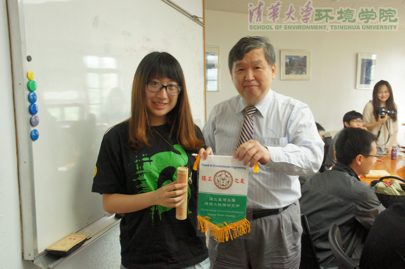 图为台湾大学环工所蒋本基教授向清华大学学生绿色协会授予“环工之友”锦旗.