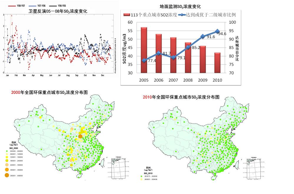 图片说明:a)通过对卫星遥感二氧化硫柱浓度长期变化趋势的分析,对2005 年以来全国二氧化硫总量的减排效果进行了评估。b)城市二氧化硫浓度达到或优于二级标准的比例由2005 年的77%提升至2010年的95%,113个环保重点城市二氧化硫平均浓度由57微克每立方米降低至42微克每立方米。c-d)近10年来,全国城市二氧化硫浓度显著下降,达标率明显上升。