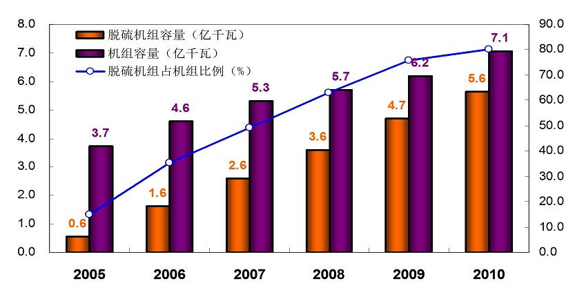 图片说明:截至2010 年底,全国火电机组脱硫装机容量比例从2005 年的12%增长到80%以上,是美国2009 年火电脱硫机组装机容量的3 倍;煤电二氧化硫排放绩效达到了2.7 克/度,优于美国2008 年3.7 克/度;仅工程减排就形成1500 亿元左右的脱硫工程设备市场和200 亿元左右的年运行费用,占“十一五”环保产业总投资的12%以上,带动环保新兴产业迅速发展;同时,也使作为世界第一大煤炭消费国的我国,成为继日、美、欧之后第四个快速实现大规模工程脱硫的重要经济体。