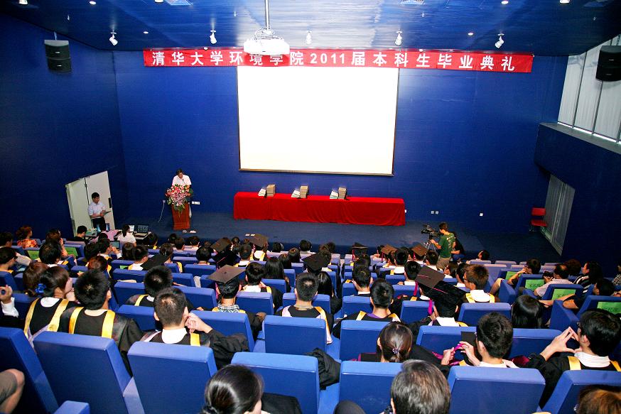 2011年7月6日下午3:20,清华大学中意环境节能楼报告厅,张晶口中一直念叨着的环七年级同学三五成群地来到这里参加毕业典礼。在此迎接他们的,是清华大学学术委员会主席钱易院士、清华大学学位评定委员会环境科学与工程分委员会主席郝吉明院士,校友代表、中持(北京)环保发展有限公司董事长许国栋,环境学院院长余刚,党委副书记刘建国,副院长蒋建国,党委副书记刘文君,院长助理刘书明,副院长左剑恶,水环境保护研究所所长、学术委员会主席黄霞,饮用水安全研究所所长杨宏伟,地下水与土壤环境研究所所长张旭,大气污染与控制研究所教师代表蒋靖坤,固体废物控制研究所所长王洪涛,环境工程设计研究所教师代表、院长助理王玉珏,环境化学研究所所长张彭义,环境生物研究所所长王慧,环境系统分析研究所所所长曾思育,环境管理与政策研究所所长常杪,学生工作组组长刘艳臣,环七年级级主任、环71班班主任温宗国,环72班班主任许嘉钰,环七年级辅导员张晶,环七年级辅导员林朋飞,以及前来参加典礼的亲朋好友们。