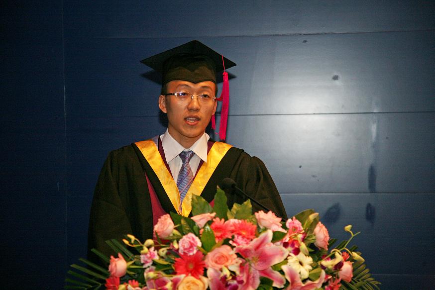 3:45,报告厅,辅导员张晶和辅导员林朋飞纷纷交口称赞的郑博同学作为毕业生代表发言。他表示:“环七年级是一个幸运的集体,是搬入新院馆后入学的第一届本科生,入学后即为院馆的美轮美奂而震撼。我们是升级为学院后的第一届本科生,毕业前十分有幸见证这一历史性的变革。我们亲身参与了国际学科评估,共同见证了我们学院向国际一流环境学科进军的步伐。我们十分有幸地经历了环境学院这迅速发展的几年,能够感受到的是:时代正赋予环境事业崇高的价值,我们无愧于当初的选择。”