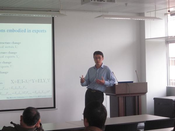 在报告中,徐明博士首先介绍了他对将“环境投入产出法”运用于国际贸易中的研究。他提出,应将劳动力因素带入对生产过程碳排放的核算中,并介绍了运用此方法得出的产生于中国出口贸易中的碳排放情况。之后,他又简单介绍了运用复杂网络分析的方法研究国际经济、运用Agent based方法研究城市系统以及运用生命周期分析的方法研究能源系统等。