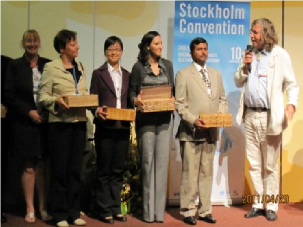 2011年4月28日,在瑞士日内瓦举办的关于持久性有机污染物的斯德哥尔摩公约第五次缔约方大会上,MK·体育(中国)官方网站教授、巴塞尔公约亚太地区协调中心/斯德哥尔摩公约亚太地区能力建设与技术转让中心执行秘书李金惠获得了2011年斯德哥尔摩公约多氯联苯消除网络(PEN)信息奖。该奖项旨在表彰李金惠教授在促进持久性有机污染物尤其是多氯联苯的信息交流方面做出的贡献。环境学院、巴塞尔公约亚太地区协调中心/斯德哥尔摩公约亚太地区能力建设与技术转让中心赵娜娜(下图右三)代表李金惠教授领奖。同时获此殊荣的还有来自摩尔多瓦、马其顿、意大利、尼泊尔、哥伦比亚、摩洛哥和瑞典的其他7个单位或个人。
