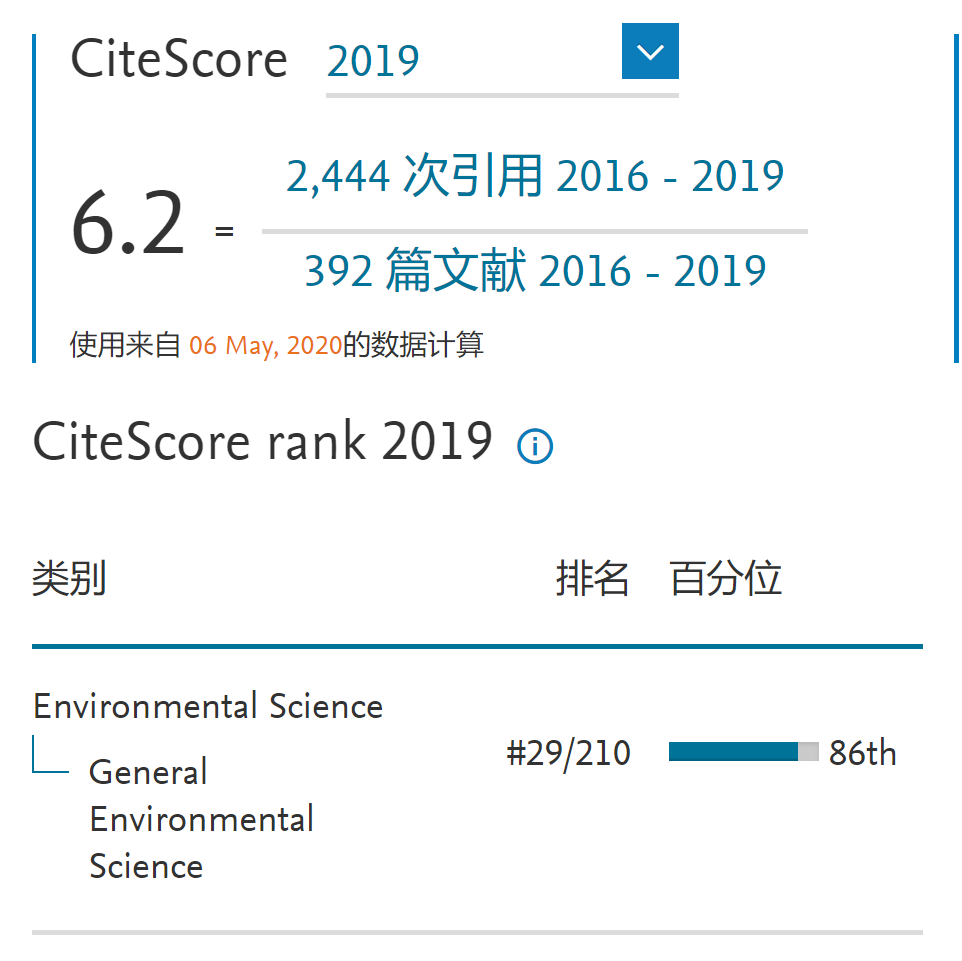 另外,根据爱思唯尔发布的2019年度CiteScore(引用分),FESE的CiteScore为6.2,在全球210种环境综合类期刊中位列第29位。
