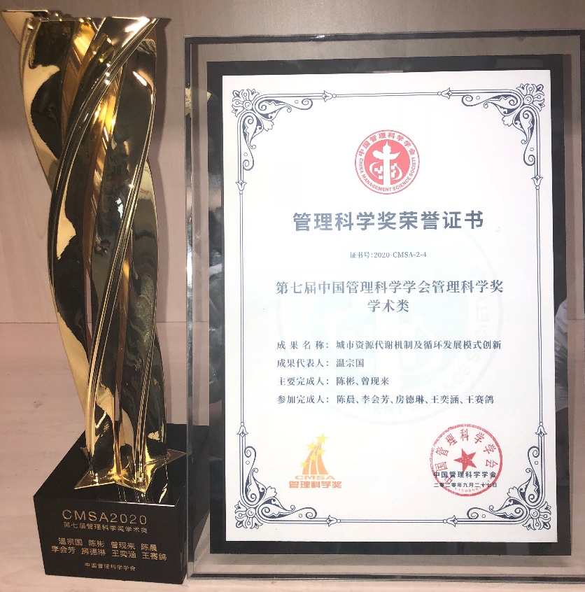 中国管理科学学会“管理科学奖”是依据国务院《国家科学技术奖励条例》和科技部《社会力量设立科学技术奖管理办法》的规定,报经国家奖励办公室批准设立的科学技术奖,旨在促进我国管理科学的发展及应用,进一步发挥管理科学对社会经济发展的推动作用,每两年评选一次。我院获奖人员有:温宗国教授(成果代表人)、曾现来副研究员(主要完成人)、博士生陈晨、助理研究员李会芳、博士生王奕涵。