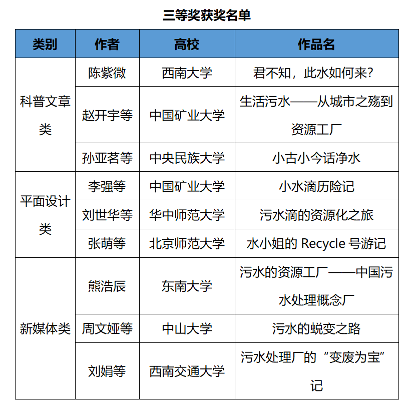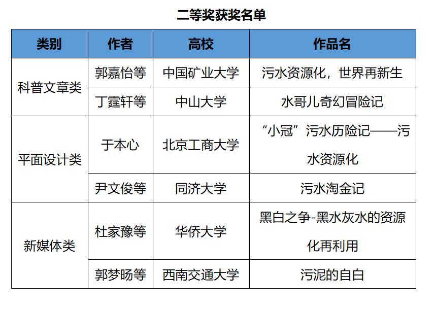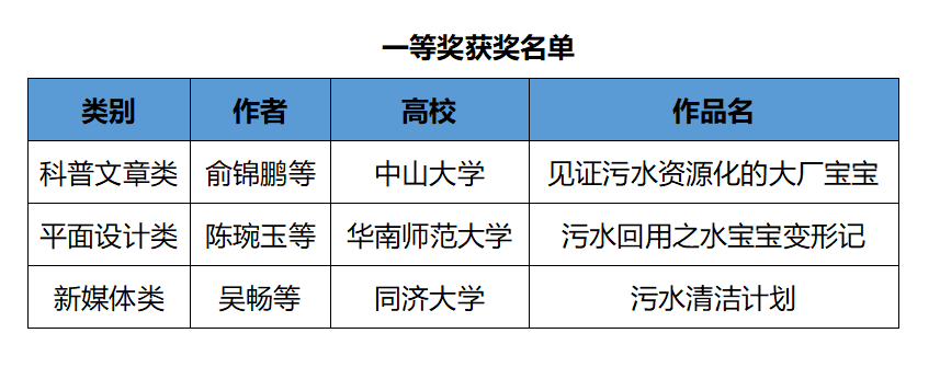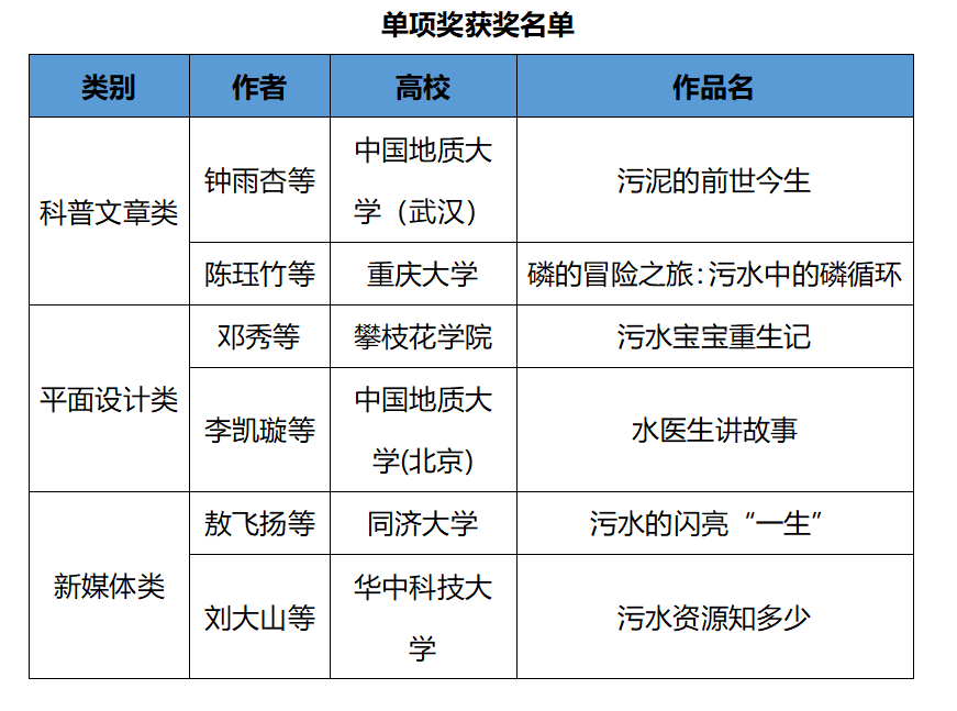 本次决赛的11位评委包括行业专家、企业负责人及媒体代表,他们从作品的主题内容、表现形式、创意性三个方面进行了评审。经过激烈角逐,25支队伍分获特等奖、一、二、三等奖及单项奖。北控水务、首创股份、中国水环境集团、中持股份、碧水源、德蓝股份6家会员单位负责人根据现场表现向参赛选手颁发了实习直通卡。