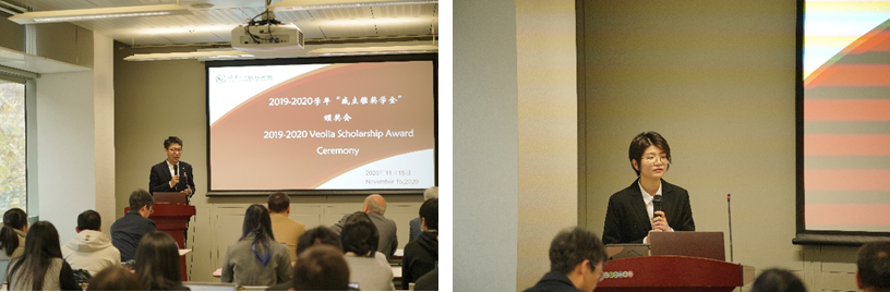 环8年级本科生张尚辰、2019级博士生辛怀佳分别代表获奖的本科生和研究生发言,分享了各自的获奖感受、学习和科研体会,并对威立雅公司表示了衷心感谢。他们表示丰富多彩的校园活动、海外实践等为他们提供了很多锻炼和成长的机会。作为新时代的青年,不仅要充满激情和雄心壮志,更要适应多元化的世界,只要自己愿意去体验、去尝试、去超越,终会找到属于自己的地方,并得到意想不到的收获。