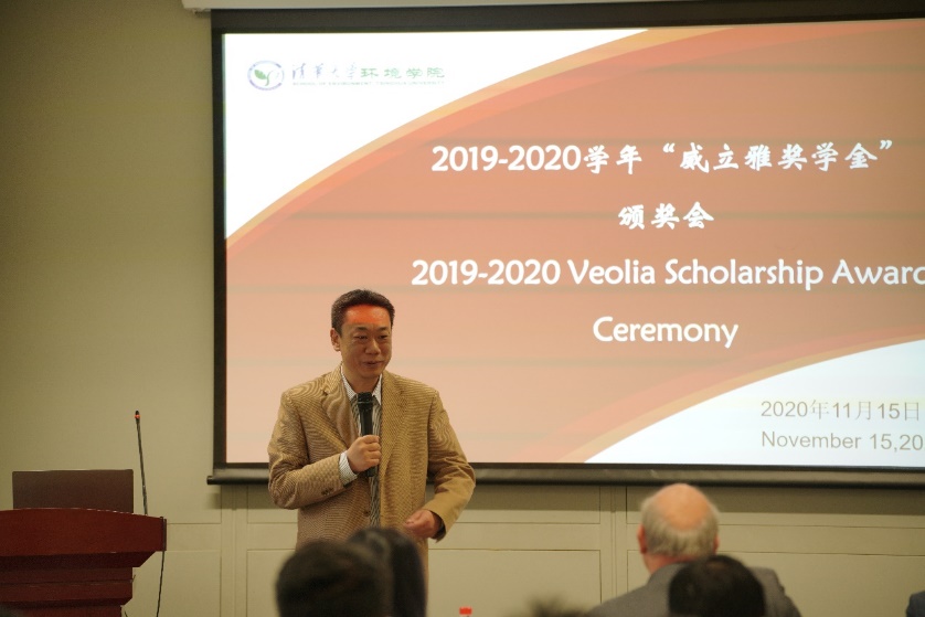 刘毅院长在致辞中介绍了近年来环境学院在学科建设和人才培养方面的取得的成果,并对获奖的同学表达了祝贺与鼓励。刘毅对于继续与威立雅公司开展新的合作表示高度肯定,期待双方能进一步加深合作,培养更多优秀人才。