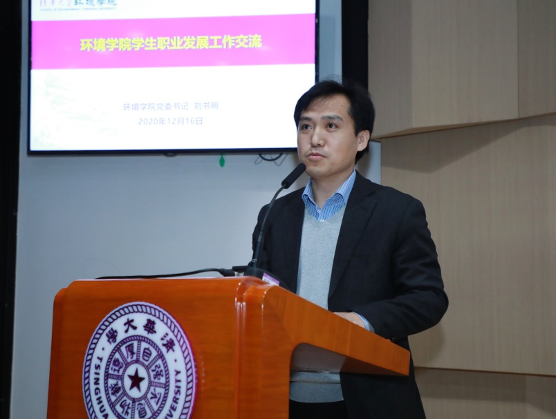 在校就业工作会议上,环境学院党委书记刘书明作为获奖集体代表作了交流发言。他介绍了环境学院将就业引导与学生思想政治教育、专业教育、国际化等工作紧密结合,构建全员全方位全过程的职业发展指导体系,全面提升就业质量的工作经验。