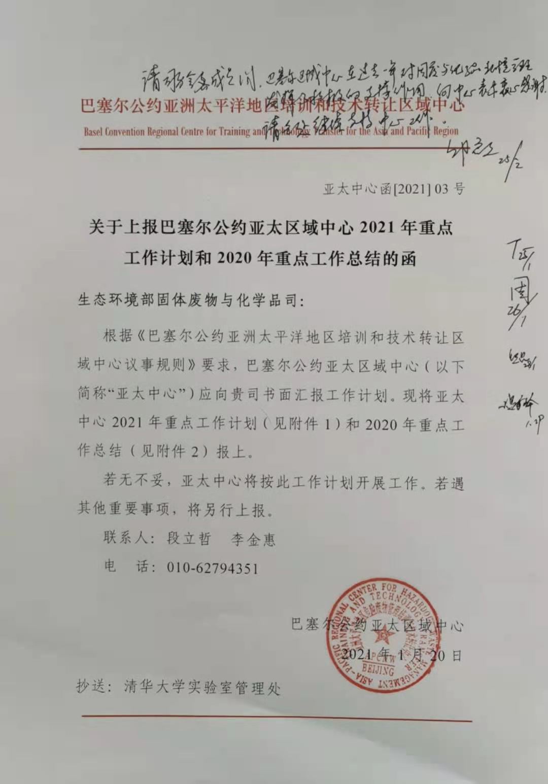 环境学院2021年1月28日电(通讯员 段立哲)2021年1月28日,生态环境部固体废物与化学品司邱启文司长在巴塞尔公约亚太区域中心(以下简称“亚太中心”)2021年工作计划和2020年重点工作总结报送函上批示,肯定巴塞尔区域中心在过去一年对固废与化学品环境管理发挥了积极的支撑作用,向中心表示衷心感谢,请各处继续支持中心工作。