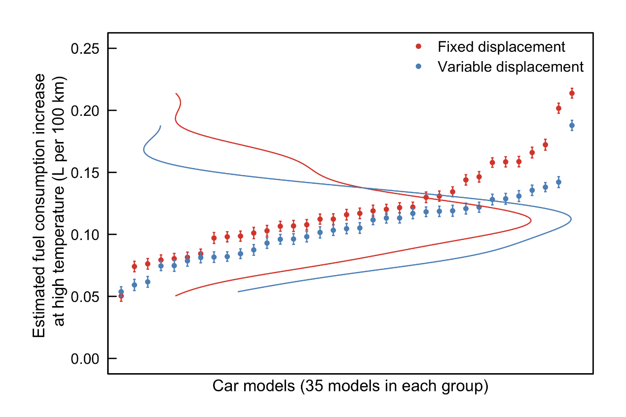 研究进一步识别了不同车型在高温条件下油耗增加幅度的差异性,反映出不同车型和不同空调技术(如采用定排和变排压缩机)的实际能效存在差异。例如,日系车型平均油耗增加为0.09升/百公里,而自主品牌车型油耗则平均上升0.13升/百公里。安装定排压缩机的空调车型油耗上升明显高于安装变排压缩机的空调车型(见图2)。通过耦合面板回归模型和随机前沿模型分析,研究发现,如果中国实施更有针对性的燃油经济性法规(如包含车用空调的能效测试)或制定更高的车用空调能效标准,可以在不增加车主经济负担条件下,每年实现约160~240万吨CO2减排量。