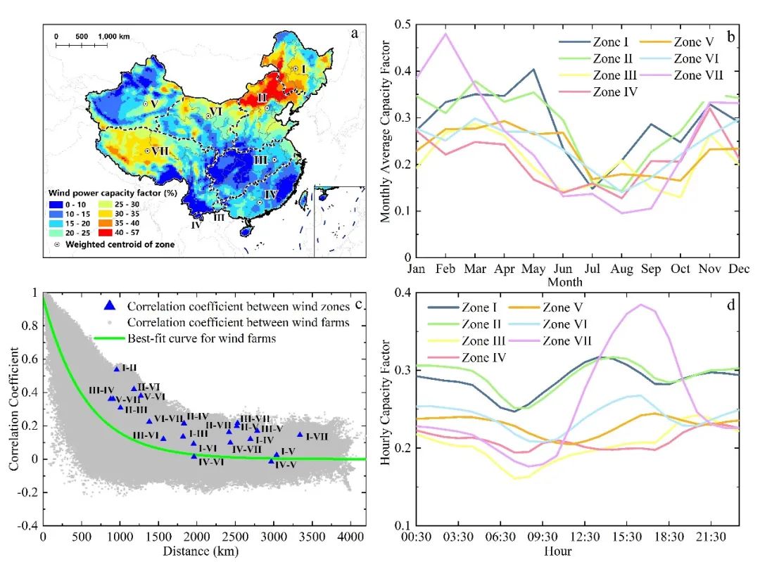 图1 (a) 我国陆上风能资源分布及基于风电波动性的风区划分;(b) 各风区月平均风电容量因子曲线;(c) 各风区风电出力序列相关系数随空间距离变化;(d) 各风区日内风电容量因子变化曲线