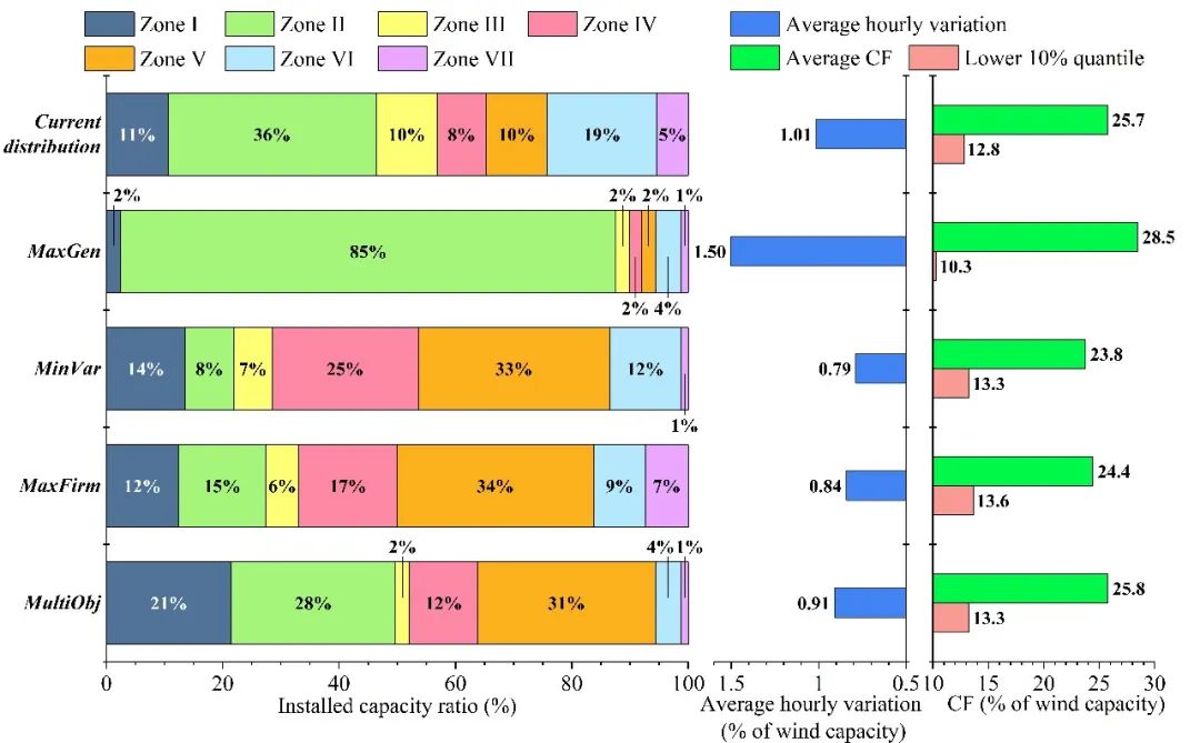 研究结果表明,受主导天气系统及地理条件影响,各风区的风电季节波动性及日内变化特征存在显著差异(图1b与图1d),为跨区域风电联合并网降低变动性、提高可靠性提供了理论基础。研究结果进一步表明,在2030年全国陆上风电装机800GW的目标下,多目标优化情景(MultiObj)与维持目前风电装机分布比例的基准情景相比,风力发电量增长0.2%、平均每小时功率变化下降10.3%,可信容量提高3.7%(图2)。通过对各风区风电渗透率的进一步分析,研究指出了未来跨区域特高压输电线路建设与风电开发协调发展的重要性。研究结果为2030年前碳达峰及2060年前碳中和目标下我国电力系统绿色低碳转型及风电发展路径规划提供了基础参考。