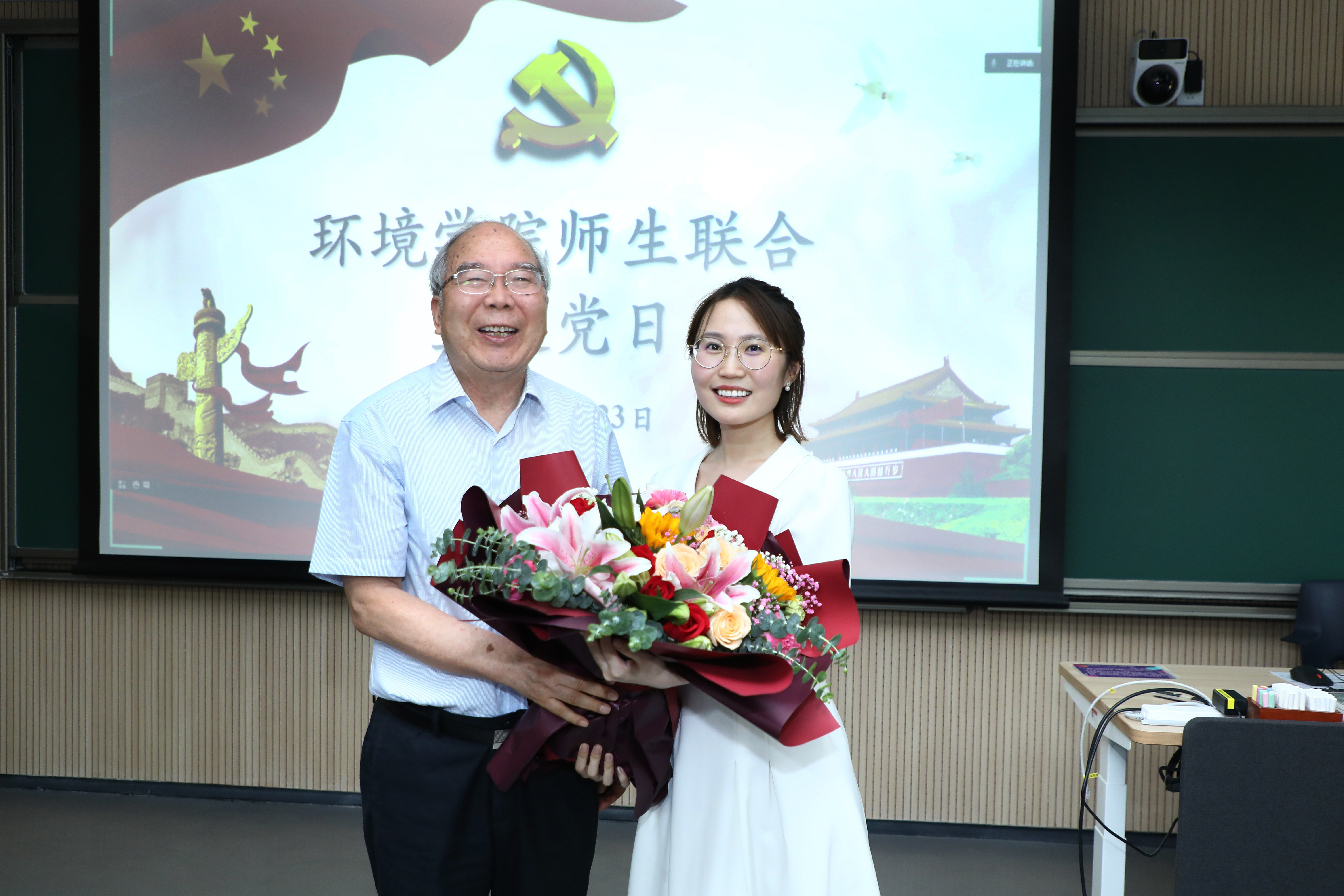 环研五党支部党员代表赵书畅为“光荣在党50年”纪念章获得者代表郝吉明院士献花