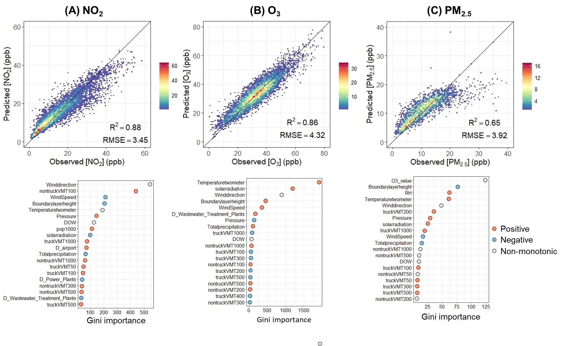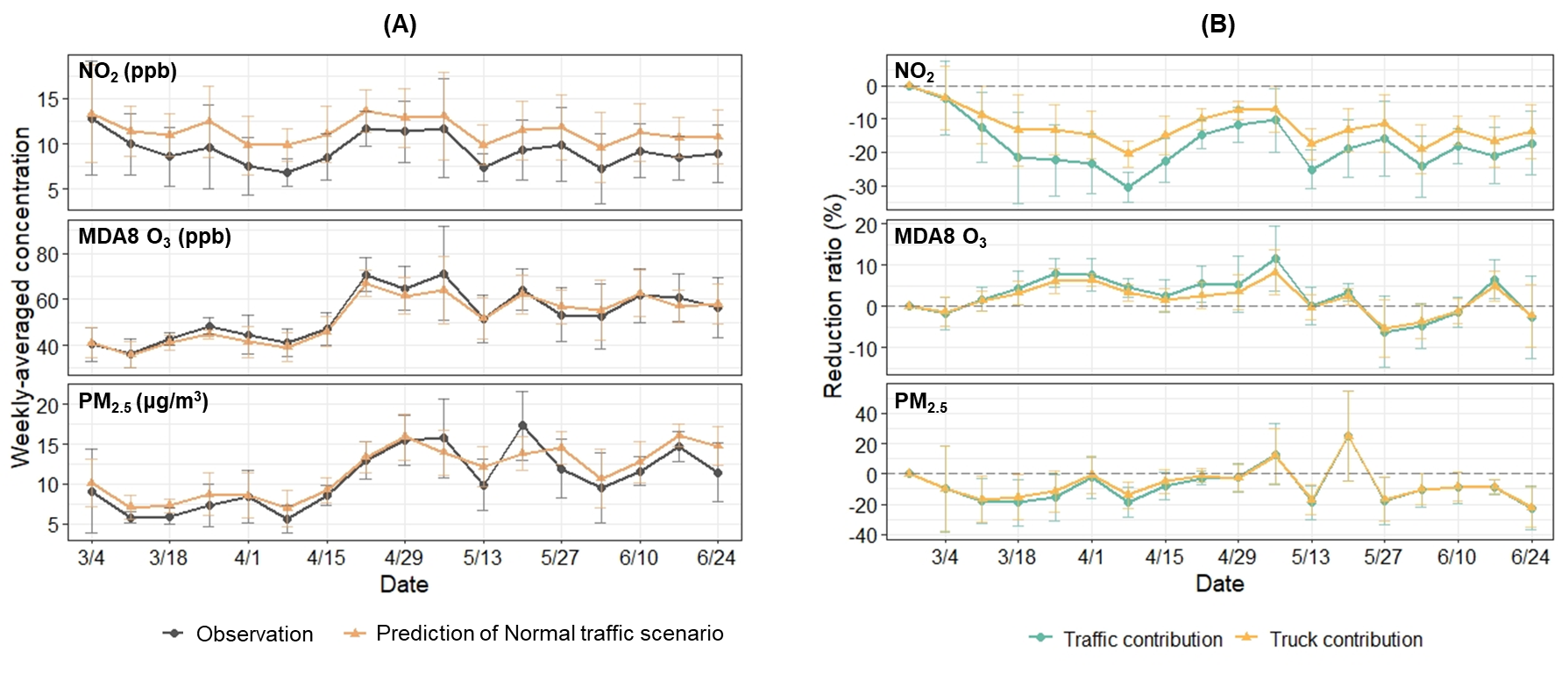 研究交通排放与空气质量响应的传统方法主要依靠排放清单编制和大气化学传输模型计算,对排放清单分辨率和动态性要求较高,也受到清单和模型本身的不确定性影响。联合团队基于洛杉矶地区2019年1月至2020年6月长达1年半的逐小时路网交通流、空气质量和气象观测数据,构建了时间序列土地利用随机森林模型。该模型以气象、交通和土地利用输入预测参数,模拟NO2、O3和PM2.5浓度表现优异,对上述三种污染物浓度的拟合R2达到0.88,0.86和0.65,同时对影响污染的气象和交通参数具有更佳的解释度(图1)。研究进一步分析了疫情期间交通活动变化对加州空气质量的影响,在最严格的封锁期间(2020年4月第2周),交通活动降低导致NO2和PM2.5浓度分别下降27.8%和17.5%,O3日最高8小时浓度增加了6%;货车是造成这些变化的主要原因,分别贡献了NO2和PM2.5浓度削减的61.0%和70.4%(图2)。