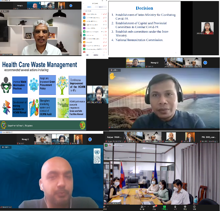 “亚太地区应对新冠肺炎疫情的挑战—来自区域国家的观点”环节邀请了项目国家尼泊尔、柬埔寨、菲律宾、老挝分享卫生防疫与医疗废物管理的现状与挑战。本环节由联合国开发计划署曼谷区域中心减灾组项目专家Rajesh Sharma(拉杰什·夏尔马)先生主持。来自尼泊尔卫生事务部管理司环境卫生和医疗废物管理科的Surendra Charasia(苏兰德拉·查拉西亚)博士、联合国开发计划署驻尼泊尔代表处技术专家Nimesh Dhakal(尼梅什达·卡尔)先生、柬埔寨卫生部医院服务司副司长So Nakry(索纳克里)博士、菲律宾卫生部卫生设施发展局高级发展管理官员June Philip Ruiz(朱恩·菲利普·鲁伊斯)先生分别就各国应对新冠肺炎疫情期间的医疗废物管理现状及挑战作了详细介绍。