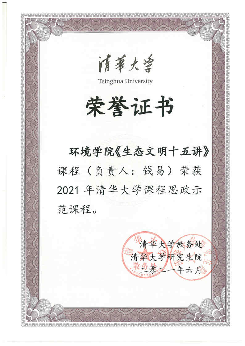 近期,环境学院开设的《生态文明十五讲》课程被评选为清华大学2021年课程思政示范课程。