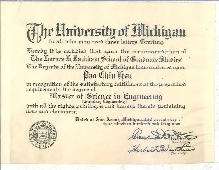 1949年,许保玖从美国密歇根大学获卫生工程硕士学位;1951年又从美国威斯康辛大学获博士学位。1954年12月,许保玖与夫人冲破重重阻力归国,成为国内第一名给排水专业博士。