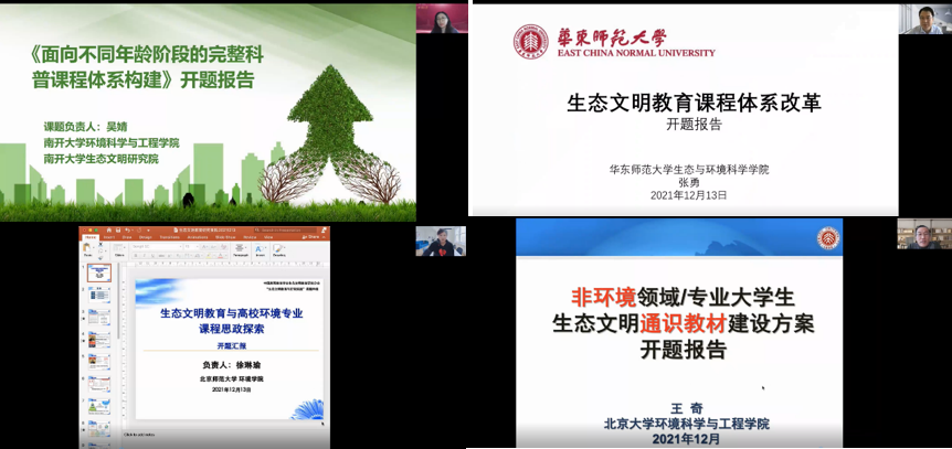 开题报告会以答辩方式进行。北京大学环境学院副院长王奇、南开大学环境科学与工程学院教授吴婧、北京师范大学环境学院副院长徐琳瑜,以及华东师范大学生态与环境科学学院环境系主任张勇作为课题负责人围绕“生态文明教育与研究实践”主题,就负责的重点课题进行了汇报,并回答了评审专家的提问。经专家组集体评议,四个重点课题顺利通过开题评审。