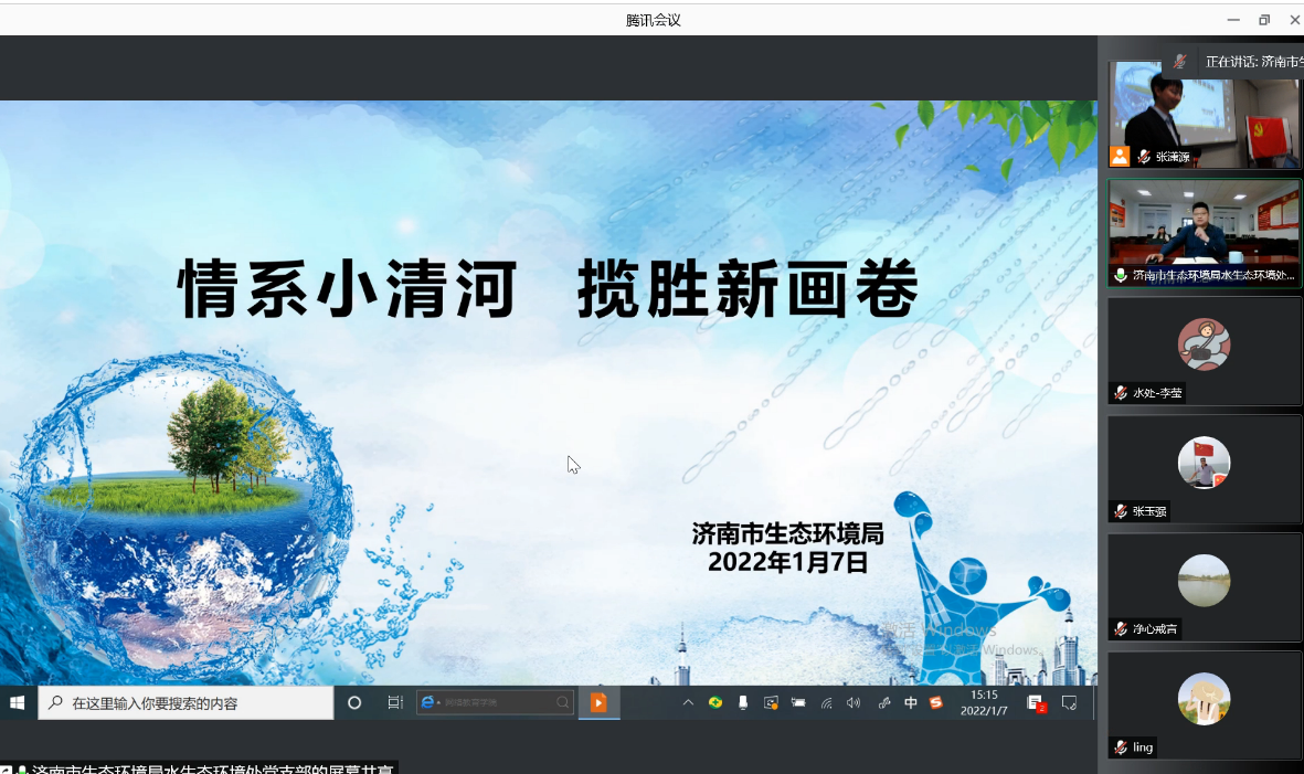 之后,李计珍作了“情系小清河,揽胜新画卷”的主题报告,从背景材料、主要做法、主要成效、存在问题及下一步工作目标五个方面介绍了济南市小清河水质治理的成功案例。作为小清河的源头城市,济南市治污的成功为全流域水质改善发挥了重要作用,水质改善为黄河流域下游地市高质量发展腾出了环境容量,打开了发展的空间,提高了环境承载力,为大幅度减少渤海湾污染作出了积极贡献。李计珍还针对济南市国控水质指数改善中存在的问题提出了下一步工作目标和计划。会议还通过视频连线在现场督察的济南市生态环境局水生态环境处同事的方式,了解了该处使用水污染预警溯源技术及设备在实际工作中取得的良好效果。