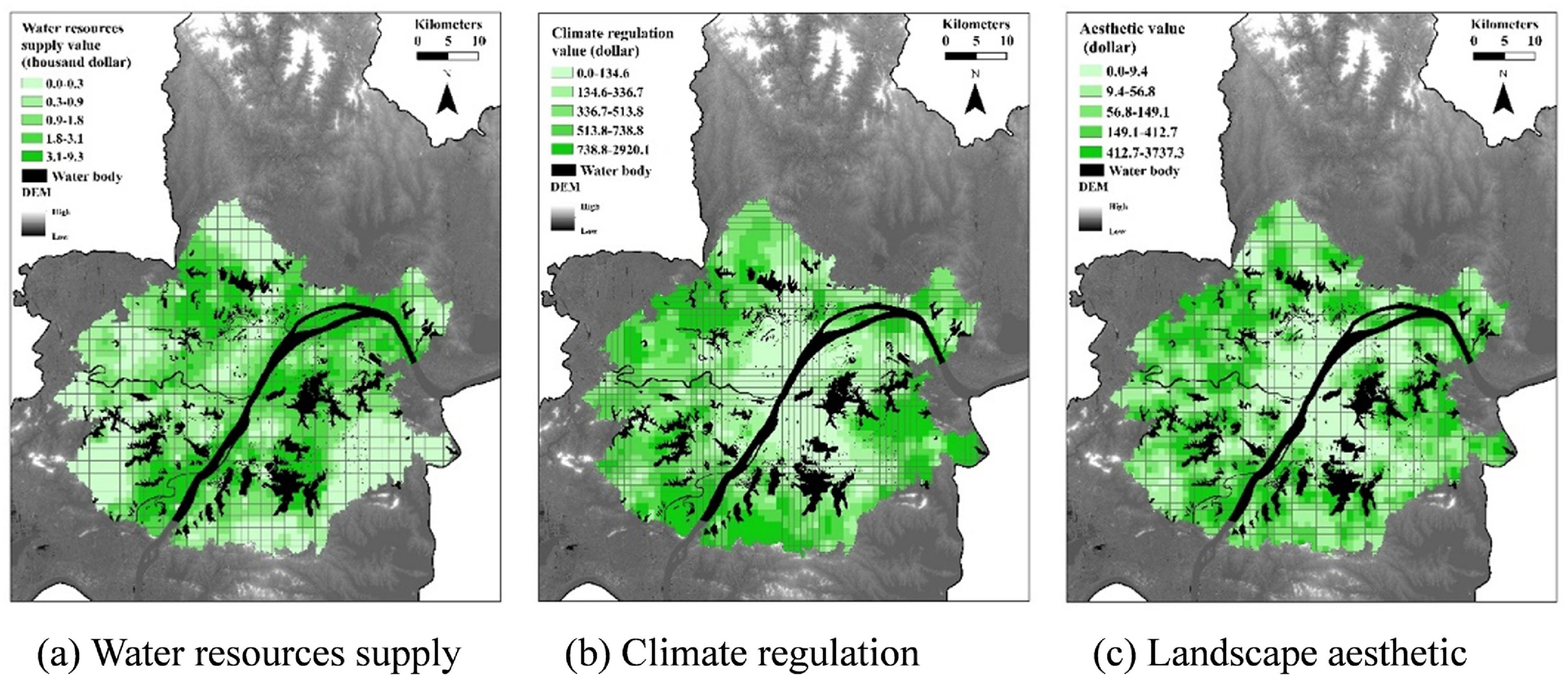 生态服务价值包括水资源供应、气候调节、景观美学效益、大气净化、水体净化及物种保护。生态系统服务价值具有空间不均衡属性,但其空间分布高值区与经济和环境压力有较大区别。对生态系统服务价值空间异质性的识别有助于判断径流控制基础设施生态补偿效益的区域适宜性。