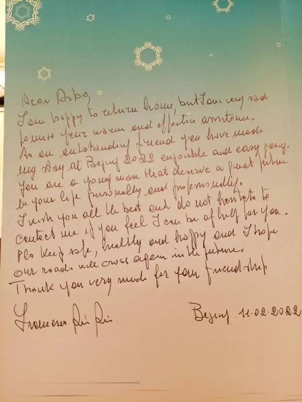 亲爱的迪波,我很高兴要回家了,但是我也由于怀念你温暖又有效率的帮助而感到难过。作为一个优秀的朋友,是你让我在2022年北京冬奥会的期间变得轻松愉悦。在你的个人生活和职业生涯中,你是一个值得拥有美好未来的年轻人。我祝你一切顺利,如果你觉得有什么我可以帮你的话,请一定不要犹豫地联系我。请一定要安安全全、健健康康和快快乐乐的,我希望在未来,我们的人生道路会再次有交集。非常感谢你(和我建立)的友谊。弗朗西斯科·里奇·比蒂