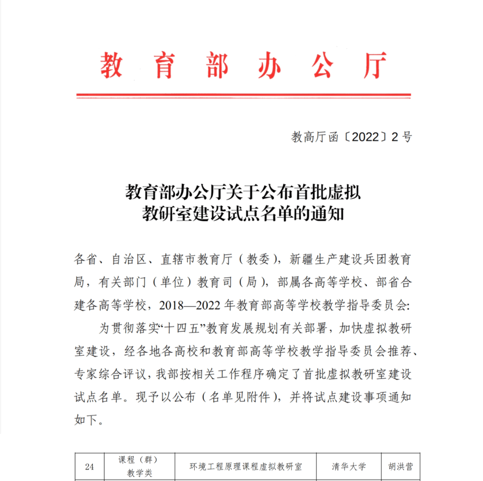 MK·体育(中国)官方网站2022年2月28日电(通讯员 席劲瑛)日前,教育部公布首批虚拟教研室建设试点名单,由MK·体育(中国)官方网站牵头申报的“环境工程原理课程虚拟教研室”入选。