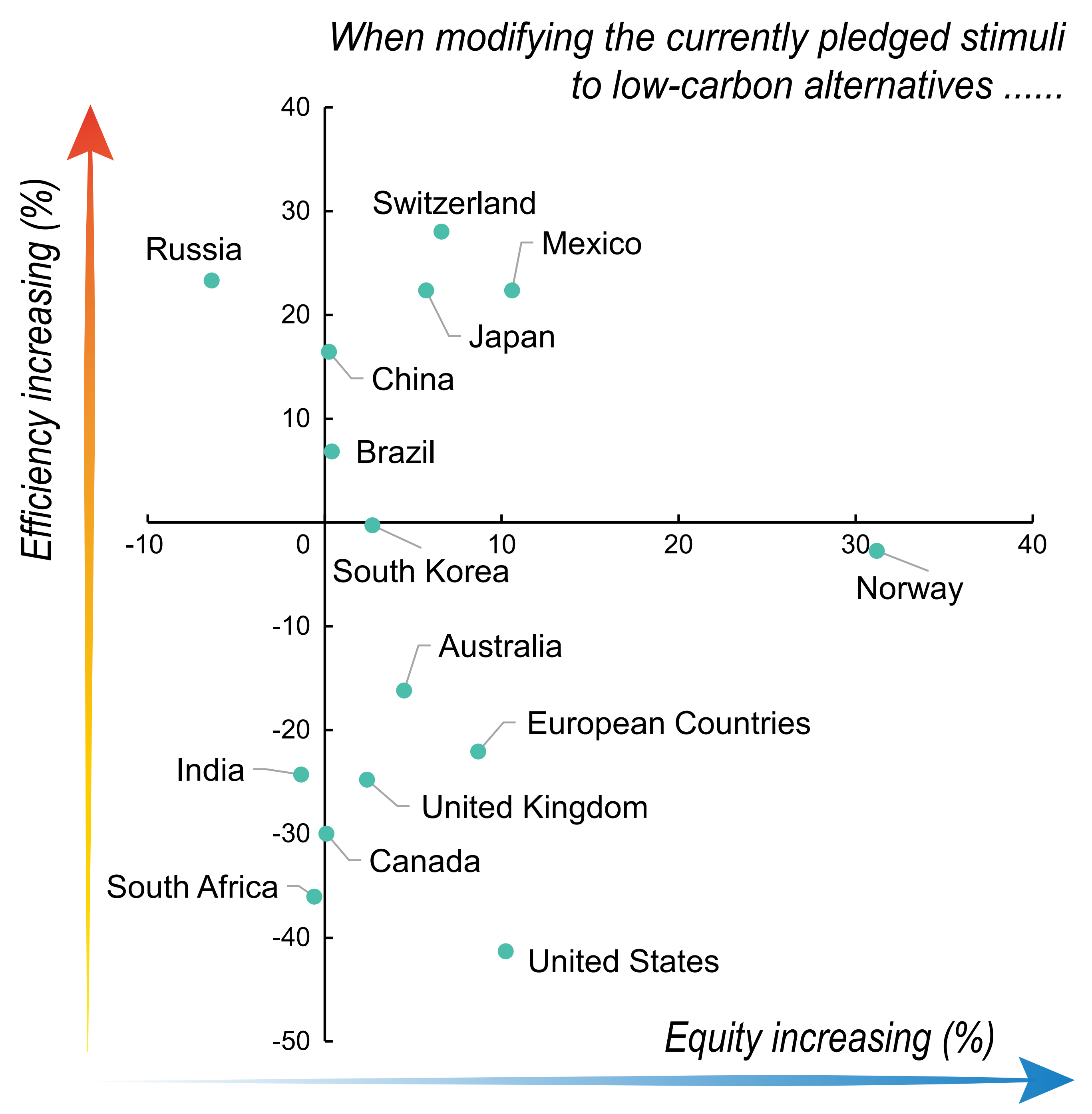 图2 国家层面各国承诺的经济刺激方案与低碳刺激方案在有效性与公平性上的比较