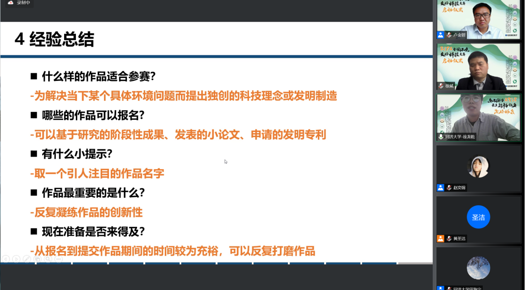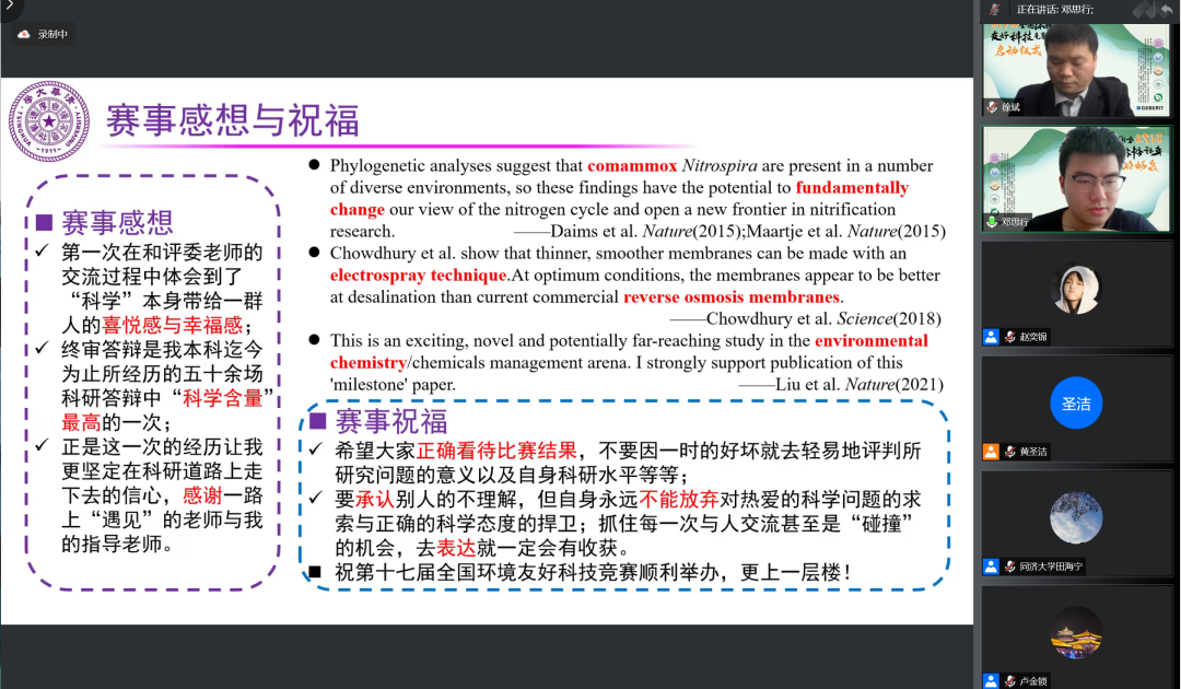 在回顾和展望环节,同济大学田海宁同学代表第十七届环科赛组委会对往届赛事进行回顾。