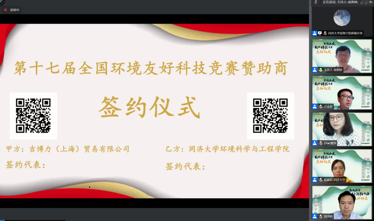 吉博力(上海)贸易有限公司与同济大学环境科学与工程学院线上签署了环科赛赞助协议。线上签约仪式后,袁慧萍代表吉博力公司发表致辞。她分享了吉博力公司的环保理念和服务宗旨,希望公司能够为环科赛成果孵化提供帮助和技术指导,为国家环保事业和人才发展贡献绵薄之力。