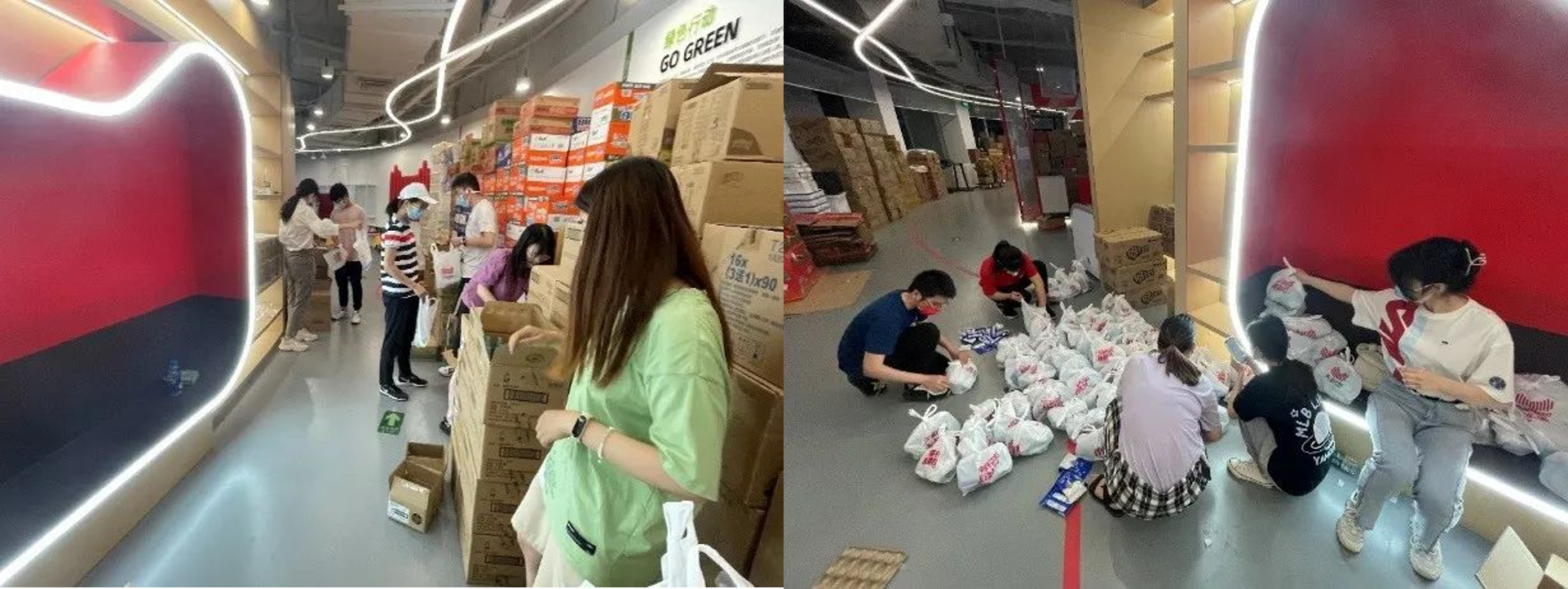 6月3日上午10点,订购物资准时到货。学院学生骨干为同学们分装、清点、打包物资。