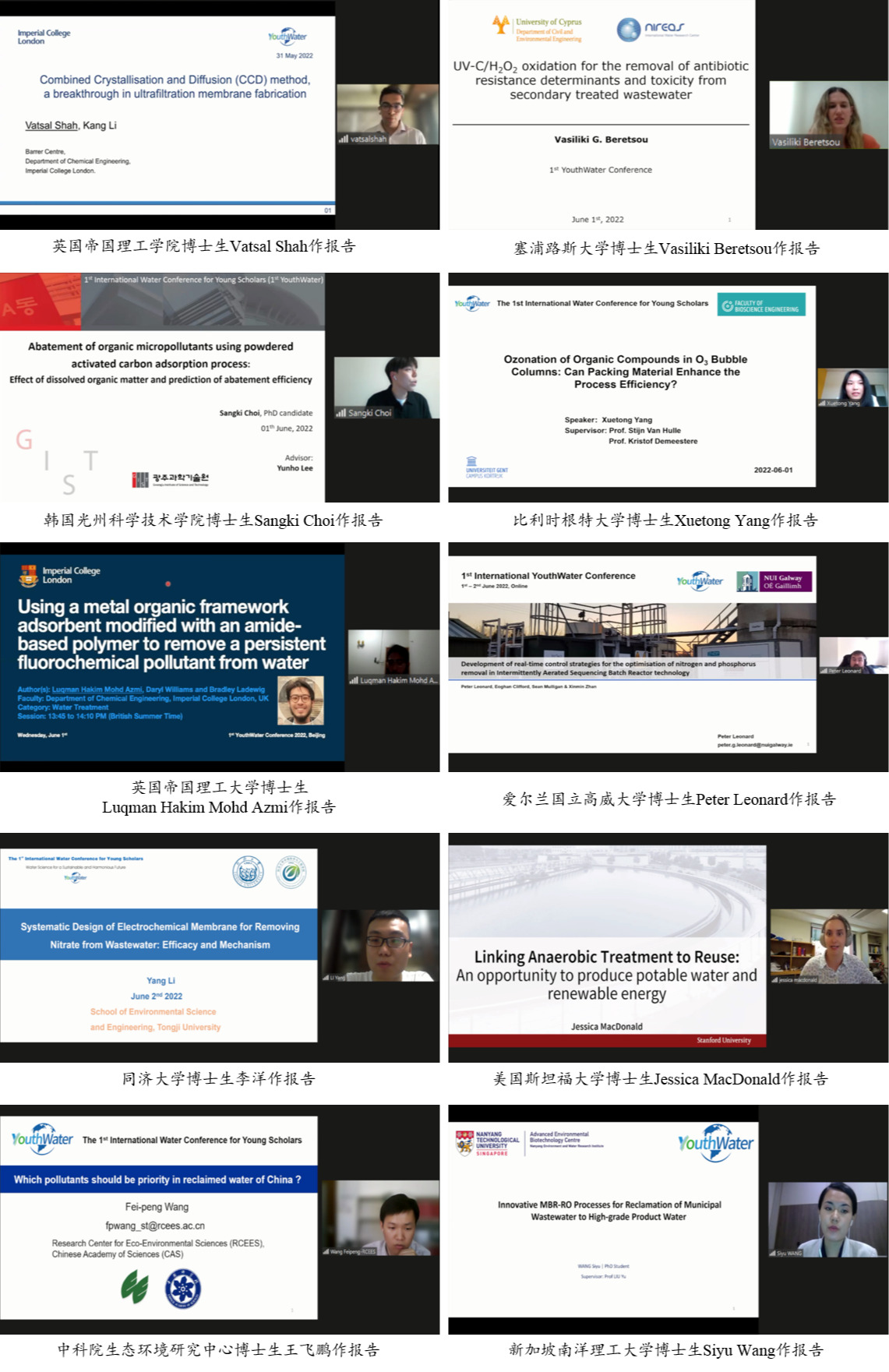 清华大学博士生徐雨晴、新加坡南洋理工大学博士生王思予、同济大学博士生李胄彦、中科院生态环境研究中心博士生王飞鹏共同主持了学术报告环节。英国帝国理工学院博士生Vatsal Shah、塞浦路斯大学博士生Vasiliki Beretsou、韩国光州科学技术学院博士生Sangki Choi、比利时根特大学博士生Xuetong Yang、英国帝国理工大学博士生Luqman Hakim Mohd Azmi、爱尔兰国立高威大学博士生Peter Leonard、同济大学博士生李洋、美国斯坦福大学博士生Jessica MacDonald、王飞鹏、新加坡南洋理工大学博士生Siyu Wang等10位青年学生围绕水质与水征分析表征、新兴污染物高效处理、污水资源化能源化、先进水处理膜组件设计制备、水处理反应器综合优化与实时控制等研究前沿作了精彩的学术报告。