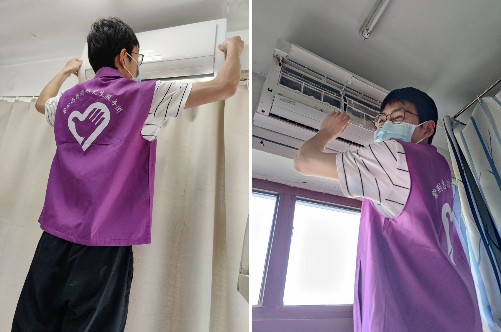 疫情管控升级后,空调修理师傅无法进校,但是天气日渐炎热,面对众多同学的空调使用需求,环硕201班的同学们主动报名成为战疫“清”年突击队空调清洗分队志愿者,在炎炎夏日为同学们送上一缕清凉。“自己动手丰衣足食,还能体会到劳动的成就感,何乐不为呢?”环硕201班班长朱柯桦笑着说。