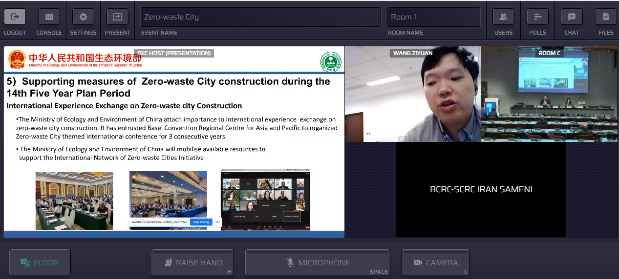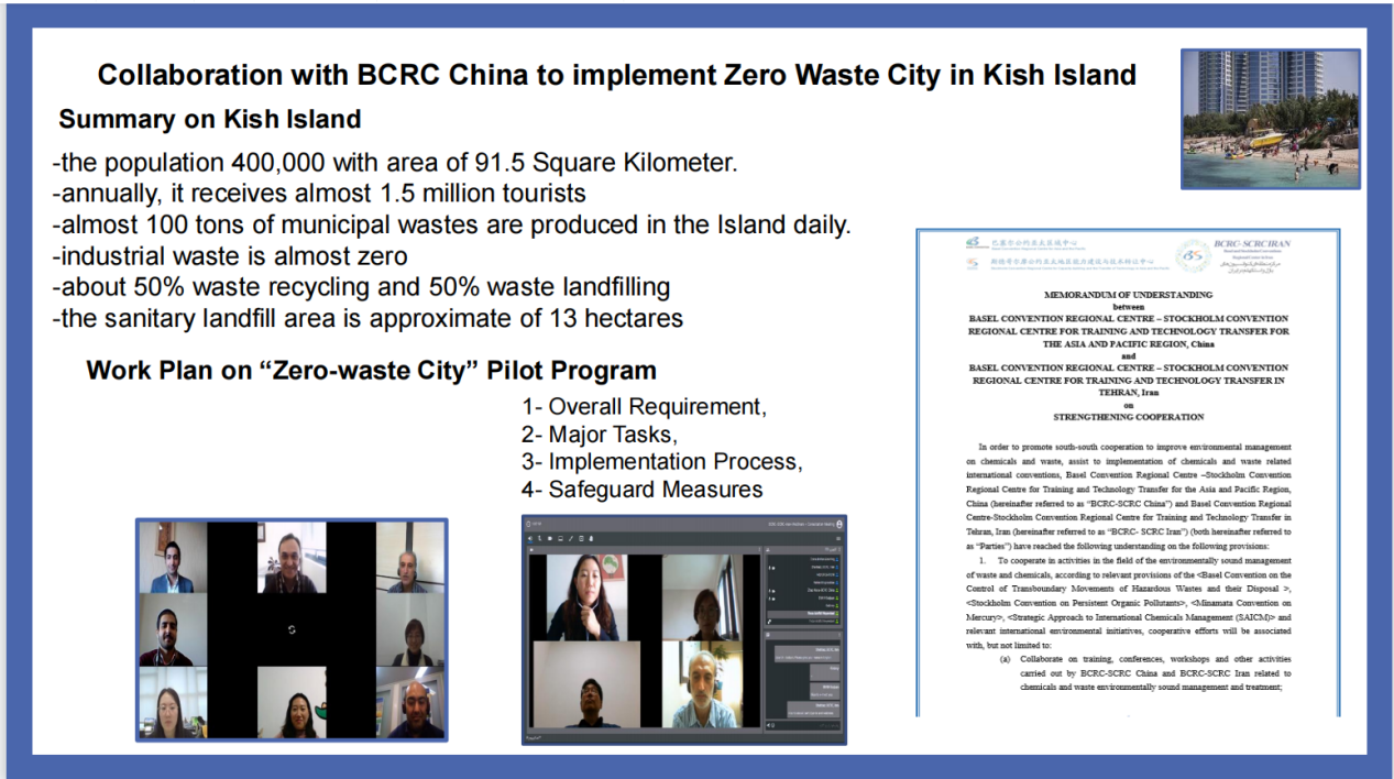 在报告环节,中国生态环境部固体废物与化学品司固体废物处王梓元就中国“无废城市”试点建设的工作进程、取得的显著成效,“十四五”期间“无废城市”建设推进计划等三个方面做了介绍。新加坡可持续发展与环境部环境政策司高级助理司长克莱尔·周介绍了新加坡“无废”总体规划,以及新加坡对食品废物、包装废物、电子废物等三类优先管理废物流的循环经济管理措施。巴塞尔公约亚太区域中心环境技术室副主任单桂娟与高级顾问克雷格·博利科瓦茨共同介绍了“无废国际城市网络”的组织进展。巴塞尔公约和斯德哥尔摩公约伊朗区域中心迈赫迪·萨梅尼介绍了伊朗在全国范围内开展的“无废”倡议,并表示巴塞尔公约和斯德哥尔摩公约伊朗区域中心将与巴塞尔公约亚太区域中心共同合作建设“无废”基什岛。