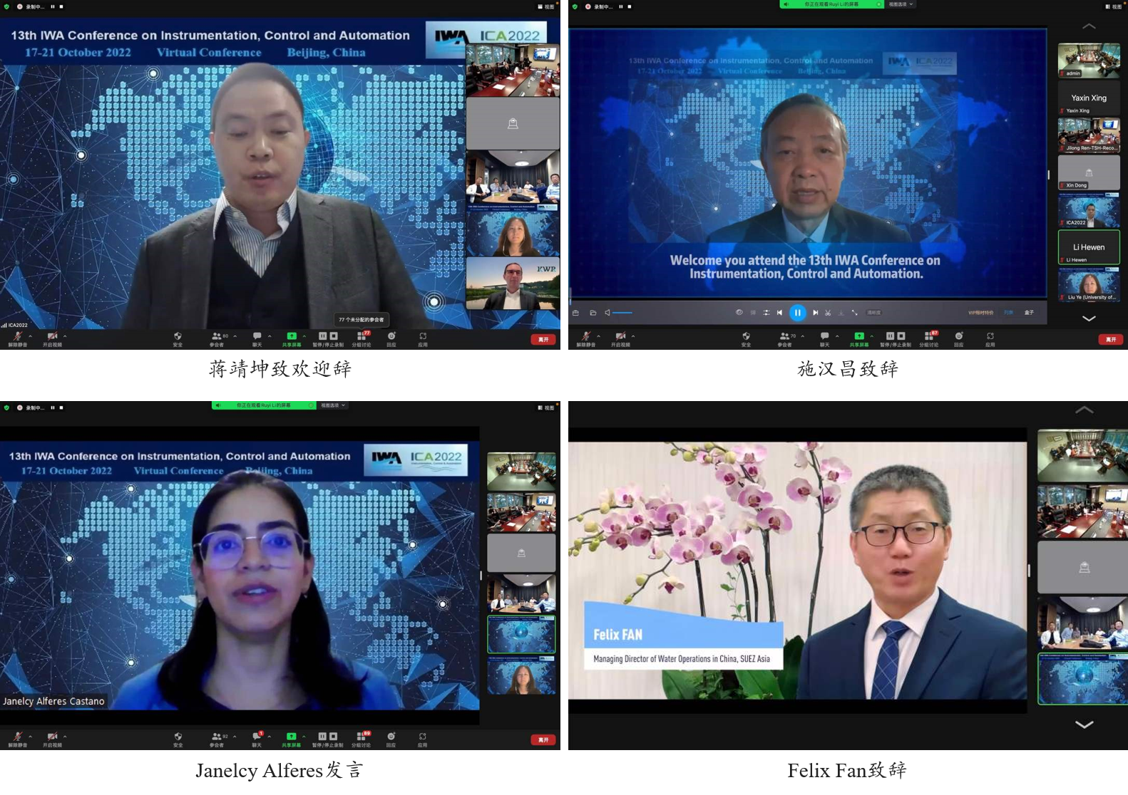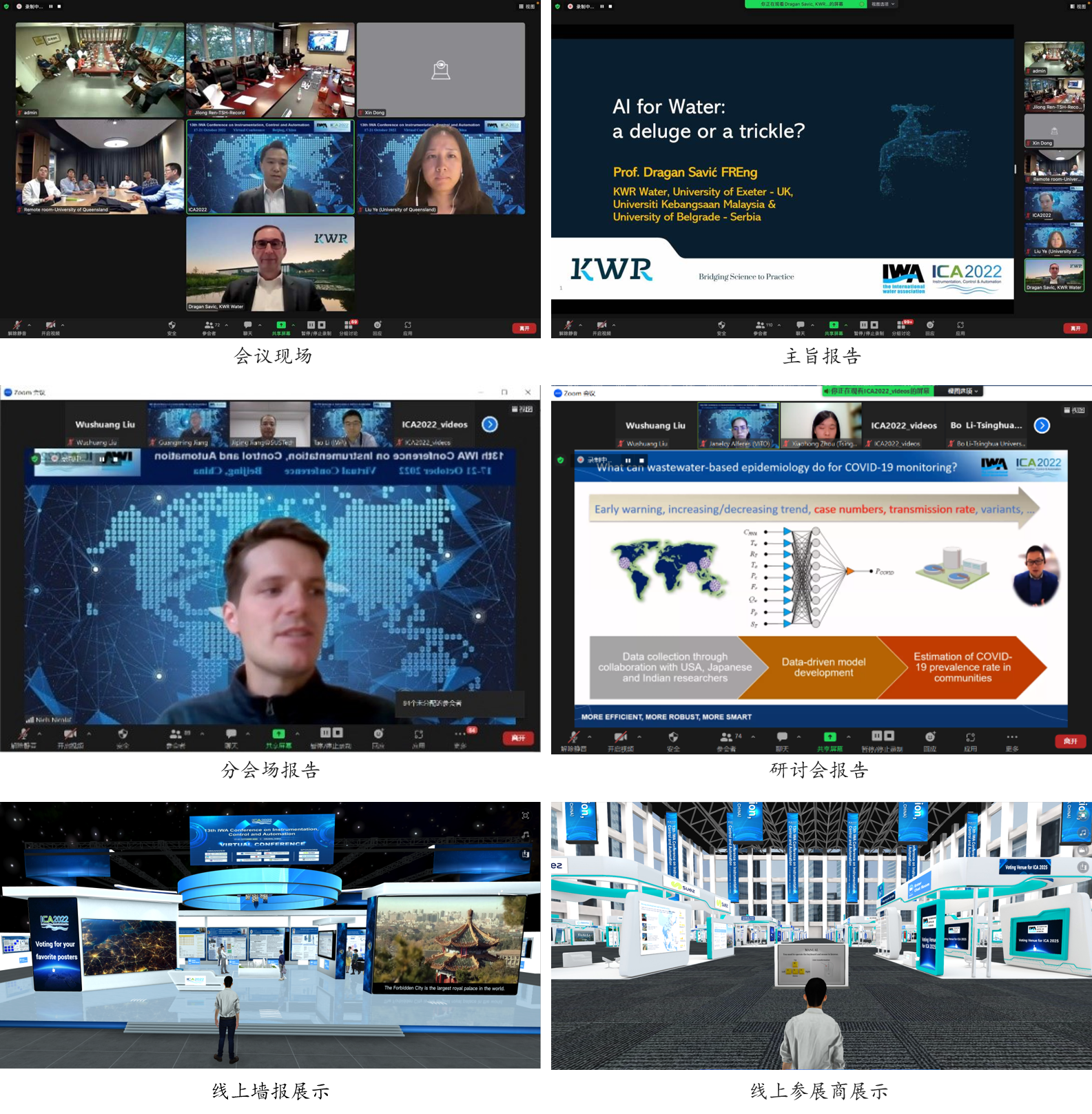 本次会议设置了13场分会,共计口头报告64个、墙报展示40余个,内容涉及污水处理中的运行控制、过程控制中的ICA、韧性基础设施的ICA、温室气体减排的ICA、污水系统智能控制、过程监测的传感技术、新型传感器的发展、用于智能检测的软传感器、用于资源回收的ICA、过程控制建模、数字孪生、人工智能对污水系统的检测和预测,以及新兴污染物的监测与控制。此外,大会还设置了三场专题讨论会,议题包括“ICA和智慧水务在中国:当下和未来”“基于污水流行病学的流行病发生和流行情况监测””你愿意挑战吗?——面向未来水系统的解决方案”。