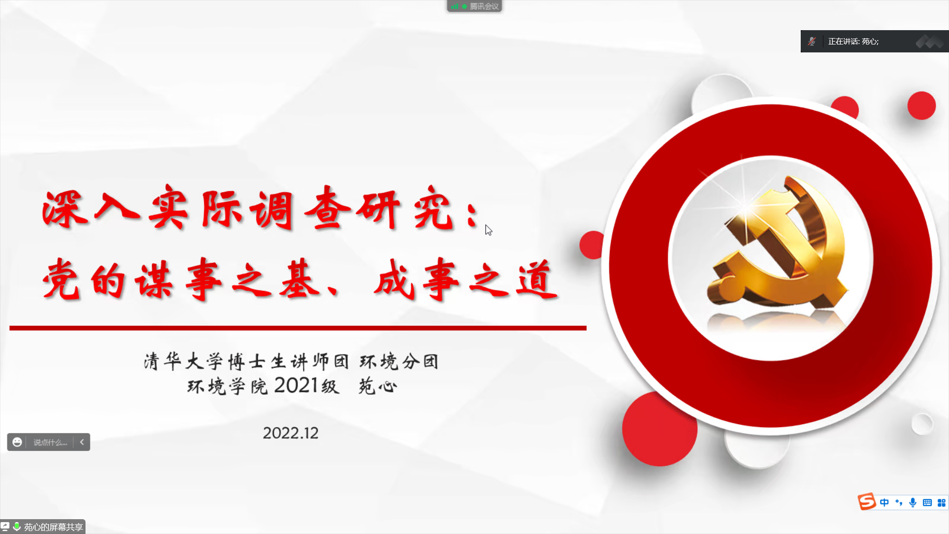 调查研究是中国共产党的光荣传统和优良作风,党的二十大报告再次强调了调查研究对新时代党的建设的重要性。为此,本次活动邀请校博士生讲师团讲师、环境学院2021级博士生苑心作题为“深入实际调查研究:党的谋事之基、成事之道”的分享。苑心以毛泽东同志在江西省寻乌县开展的农村经济调查为例,讲述了“没有调查,就没有发言权”这一重要论断提出的背景和意义;介绍了建国之初毛泽东、周恩来、刘少奇同志,改革开放初期邓小平同志,以及习近平同志自任浙江省委书记以来,在提出重大战略、做出重大决策前所开展的扎根基层、深入实地的调查研究工作。通过学习,大家对于调查研究“真”“准”“深”的意义和作用有了更加深刻的认识。