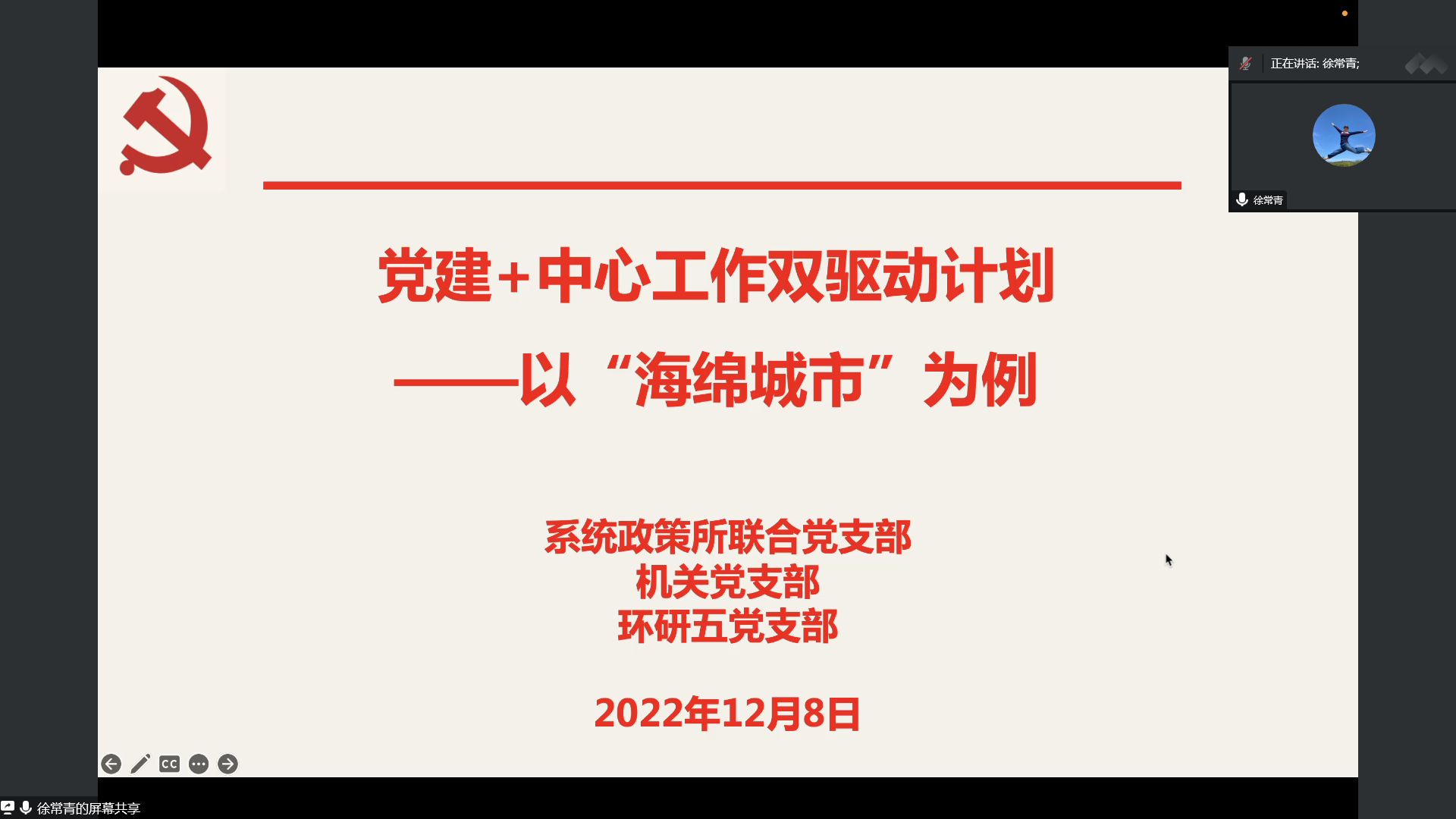 9月29日,温宗国围绕“双碳”主题分享了第一期“党建+中心工作”融合驱动工作经验。本次活动中,系统政策所联合党支部宣传委员徐常青代表系统政策所贾海峰教授以“海绵城市”为主题进行第二期的分享。徐常青深入介绍了团队当前将党建工作与中心工作相融合的驱动路径以及所取得的成果,并凝练总结了多条机制经验,包括:践行教书育人,开设4门本研中英文课程,出版6部相关教材;服务国家战略需求,向党中央、国务院提出长江经济带绿色发展与水网建设的战略对策和建议;推动产学研深度融合,将相关研究成果推广应用至全国各城市的19家单位,累计服务面积达5200平方千米,服务人口达595万人。