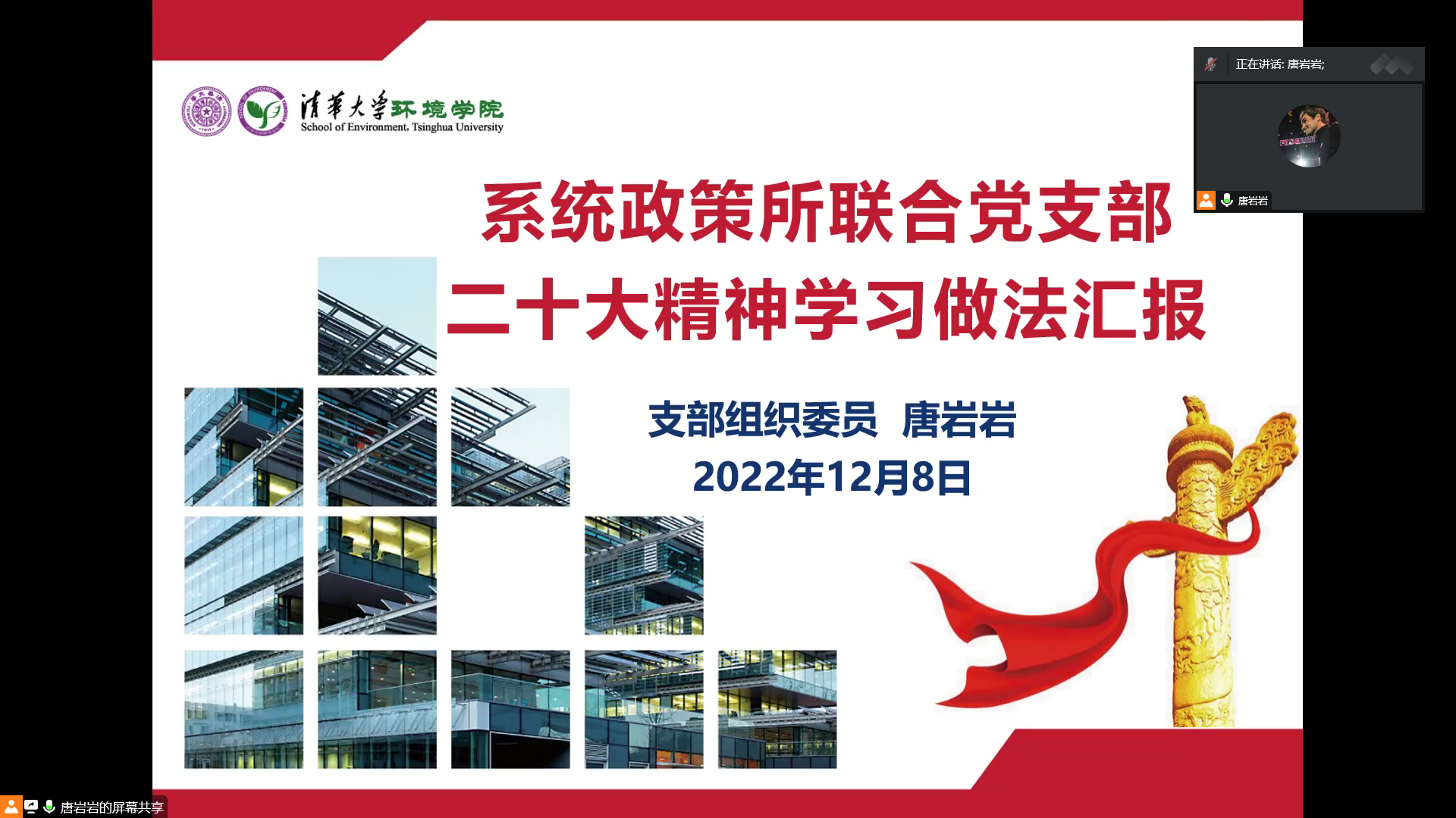活动伊始,系统政策所联合党支部组织委员唐岩岩带领大家回顾了党支部学习党的二十大精神的经验做法。为了更系统、深入地学习党的二十大精神,系统政策所联合党支部在党的二十大召开前梳理了学习资料清单,设计了调研课题,并开展了红色观影等活动。在党的二十大召开期间,党支部集中观看直播、领悟大会精神,组织交流、分享大会直播感想。在党的二十大召开后,党支部组织全面学习大会报告,引导党员及群众把思想和行动统一到党的二十大精神上来。总体来说,党支部从丰富形式和强化内容两方面出发,不断创新组织生活形式,师生党员和群众参与度高、反馈积极,活动取得良好效果。