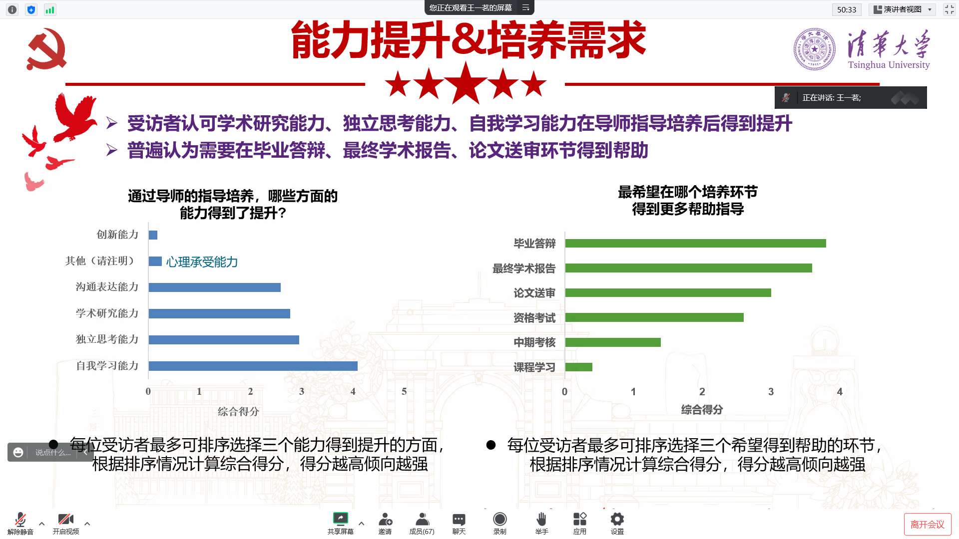 教书育人是教研所的首要职责使命。只有统筹好育人育才的“供给端”与“需求端”,才能避免形成学生群体和教师群体的信息孤岛,从而精准对接统筹施策。受系统政策所联合党支部委托,环研五党支部围绕教研所和课题组学生培养等方面面向两所全体研究生开展了匿名调研,共收集样本22份,涵盖硕士生、普博生与直博生。王一茗介绍了本次调查数据和分析结果。受访者普遍认可当前工作在学术创新能力培养、思想政治素质提升和实践创新能力培养方面取得的成效,希望导师进一步加强就业指导和人文关怀。同时,同学们最希望在职业生涯规划、学术能力培养和心理健康教育等方面得到帮助,也特别关注最终学术报告、开题和答辩等培养计划环节。另外,本次调研还收集了学术交流、教研所建设、成果应用、师生关系等方面的改进建议。