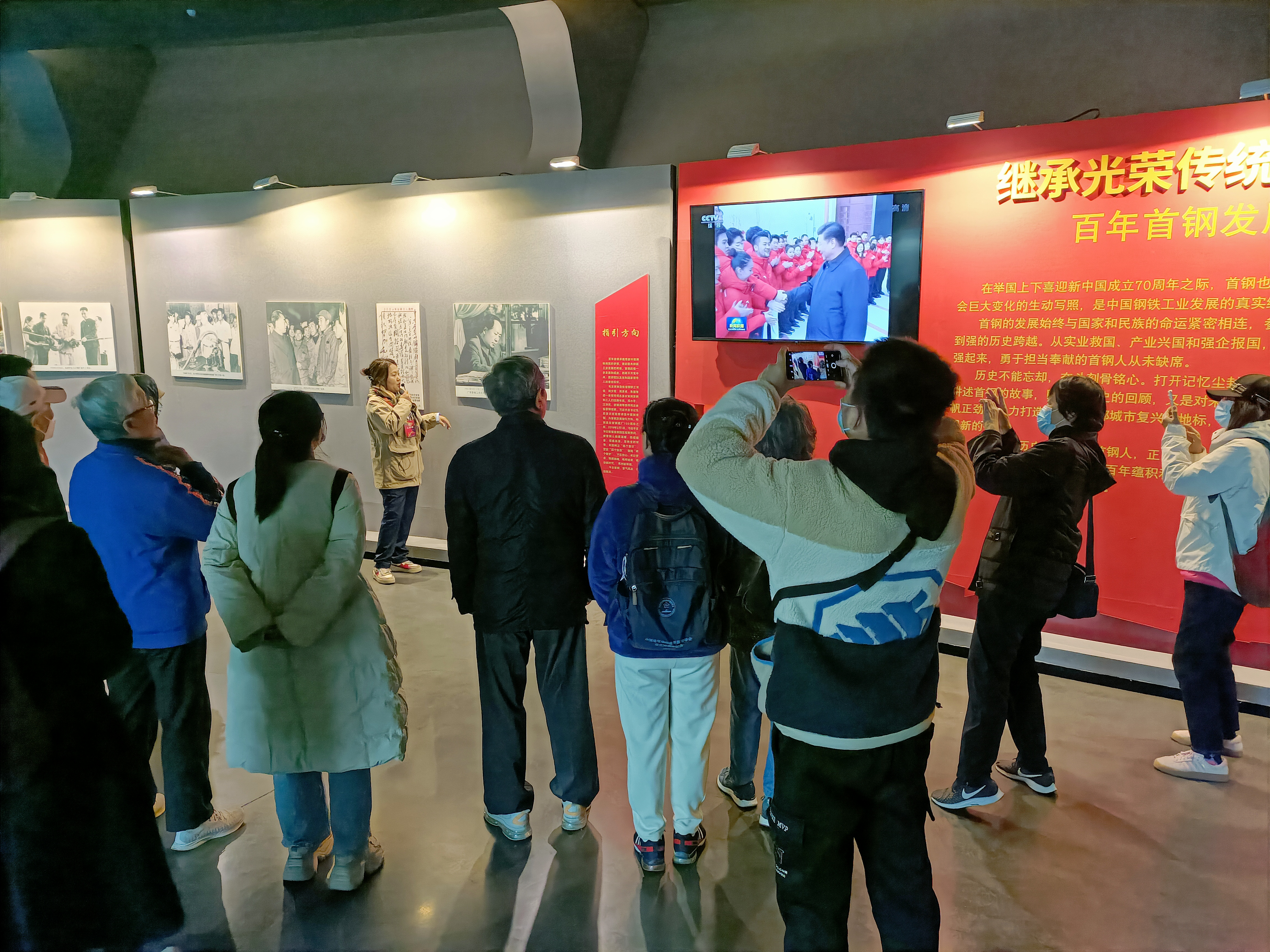 大家首先走进陶楼爱国主义教育基地,跟随讲解员的指引参观展室,了解首钢历史。首钢园始建于1919年,是我国钢铁工业的缩影、改革开放的一面旗帜,参与和见证了中国钢铁工业从无到有、从小到大、从大到强的历史跨越,参与和见证了中国人民从站起来、富起来到强起来的伟大飞跃。十多年前,在筹办北京2008年奥运会时,为了还首都一片蓝天,首钢熄灭炉火,率先实施钢铁业整体搬迁。首钢园区在首钢石景山厂区原址上开发、建立,是我国第一家以工业文化遗存为特色的主题文化园区。行走在首钢园区,大家看到这里的一切都倾注着首钢人的心血,展示着工业遗存与现代工业技术的创新融合。通过参观学习,大家了解了首钢的建厂背景及从历经磨难建厂、快速发展、改革腾飞到搬迁调整再到转型发展的历史过程,感受到了我们国家日新月异的发展。