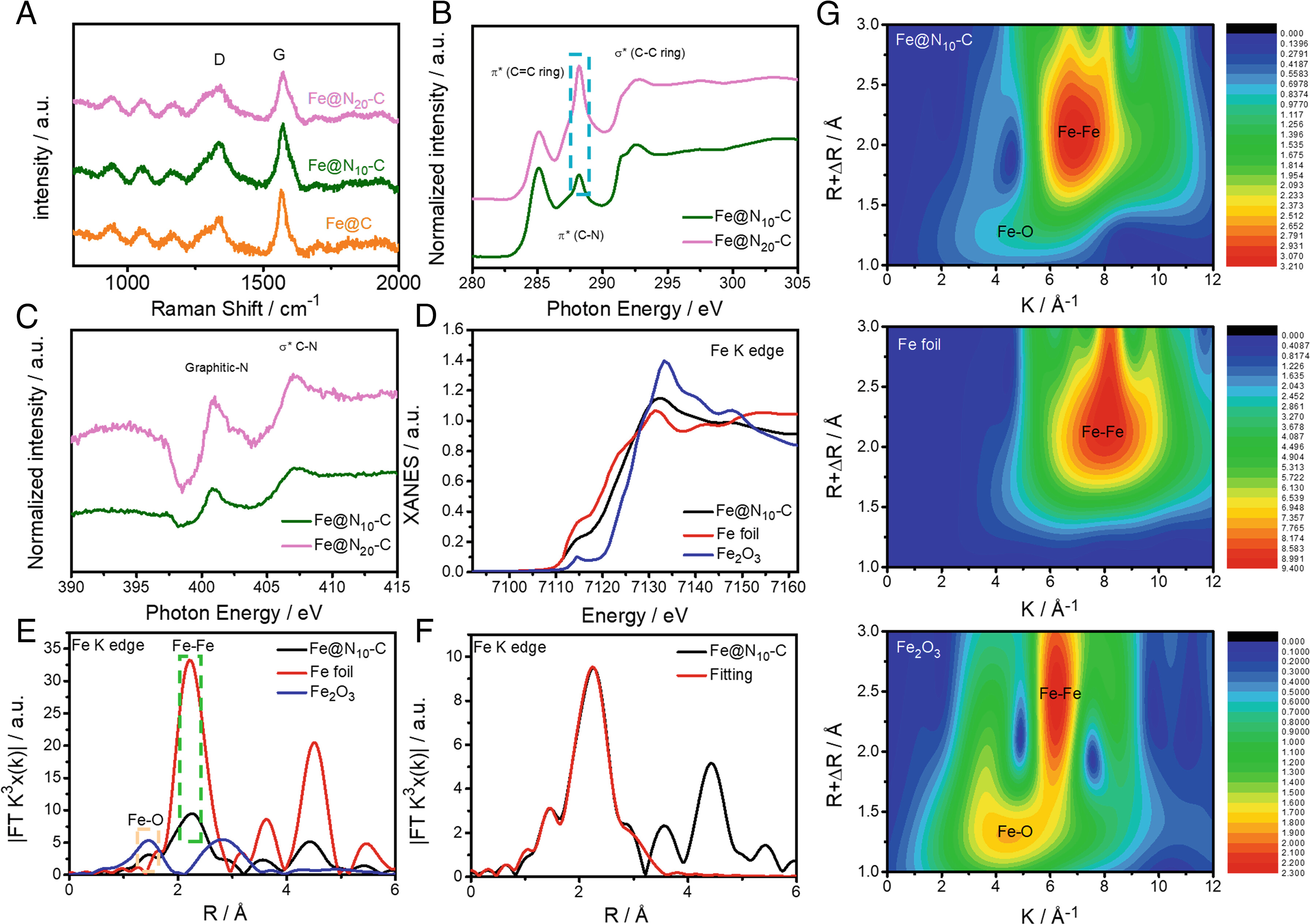 研究采用同步辐射分析了Fe@Nx-C催化剂中Fe、N和C位点的价态和配位环境,进一步证明在热解过程中形成了氮掺杂的碳结构。在热解后,Fe@Nx-C催化剂中的氮种类主要是石墨氮。Fe@Nx-C的主要活性位点是邻近N位点的C活性位点(CN)。Fe@N10-C催化剂活性的增强归因于Fe NPs周围的碳层中适量的氮掺杂物。