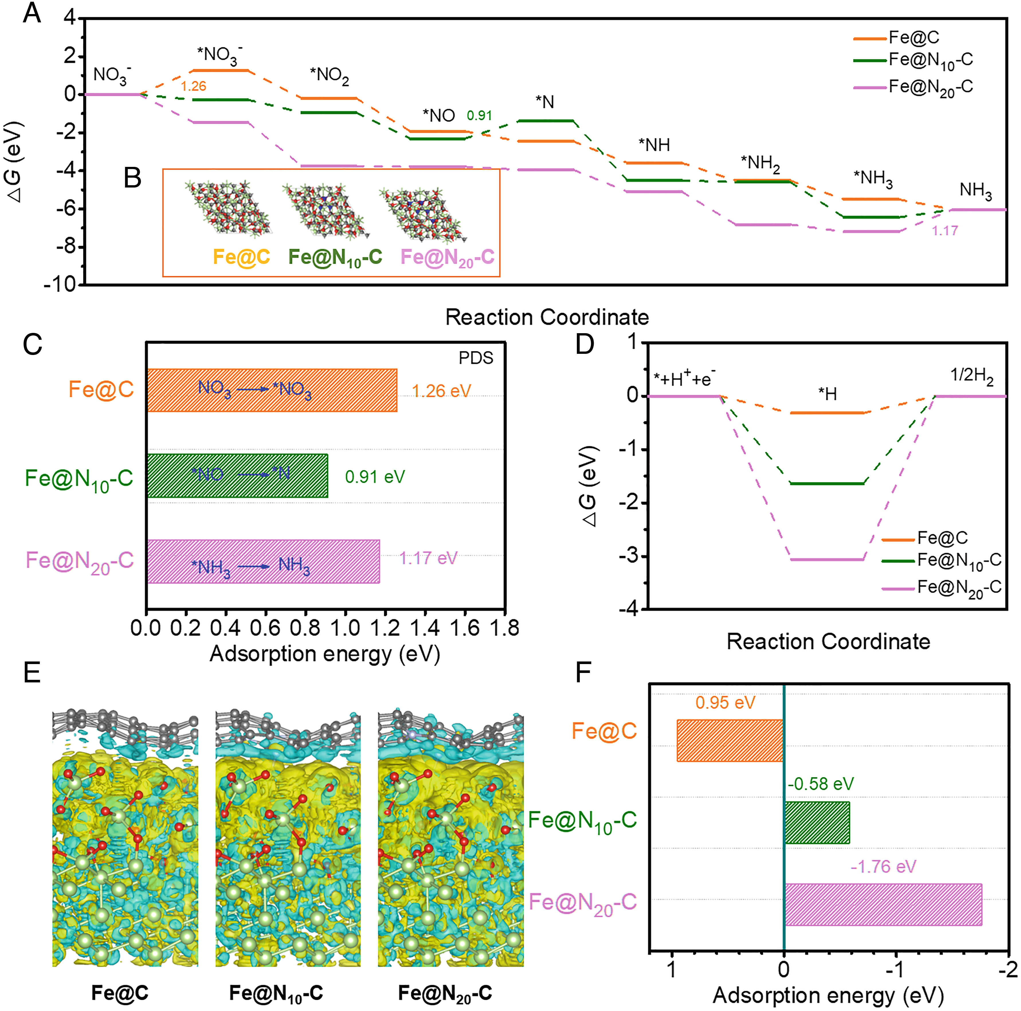 为了深入研究氮元素在激活C原子和提高Fe@N10-C的电化学硝酸盐还原活性方面的作用,该研究进行了密度泛函理论计算。通过差分电荷图揭示了Fe@N、Fe@N10-C和Fe@N20-C这三个代表性模型的活性位点,证实了电荷转移发生在CN位点,且掺入N会导致邻近的C原子发生扭曲。随后,研究了N掺杂对电子结构的影响。在CN位点有更明显的电荷积累,这表明N掺杂增加了电荷密度,从而促进了NO3-的吸附。Bader电荷分析也证明CN位点显示出更大的电荷转移,进一步表明CN是活性位点。为了更好地理解C原子的激活和Fe@N10-C催化剂活性的来源,课题组研究人员研究了Fe和N掺杂的碳之间的相互作用。差分电荷图表明,N掺杂影响了电子从Fe NPs转移到N掺杂的碳上,导致C原子被激活,这进一步影响了反应物分子的吸附,提高了反应动力学。