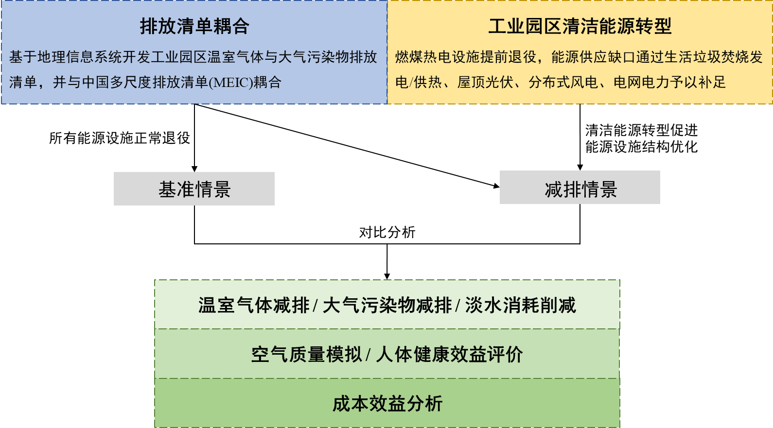 本研究开发了涵盖我国850家工业园区能源供应、温室气体及大气污染物排放、淡水消耗等指标的地理信息数据库,耦合能源系统分析、生命周期评价、空气质量模拟、健康影响评价、成本效益分析等方法,定量揭示了工业园区清洁能源转型的降碳潜力、淡水节约、空气质量改善和人体健康效益,并识别了能源转型带来的技术成本和社会效益。工业园区清洁能源转型具体措施包括:(1)燃煤设施提前退役;(2)推广生活垃圾焚烧供热/发电;(3)部署屋顶光伏和分布式风电;(4)外购电网电力。