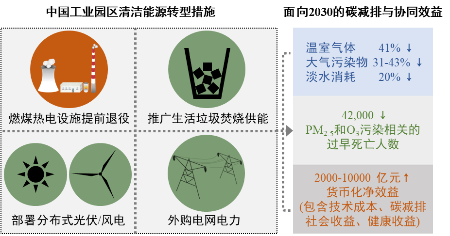 研究发现,850家中国工业园区在清洁能源转型情景下,相对于2030年基准情景,可实现温室气体减排41%(相当于2020年全国温室气体排放的约6%),协同削减SO2、NOX和PM2.5排放31%-43%,协同节约淡水消耗20%。研究通过采用大气化学模型并考虑未来人口年龄结构演变与空间分布等参数,发现工业园区清洁能源转型通过削减大气PM2.5和O3浓度可在2030年避免约4.2万过早死亡人数。综合分析设备与燃料相关技术成本、货币化的降碳效益和人体健康效益,发现工业园区清洁能源转型可带来0.2-1.0万亿元的年度净收益。