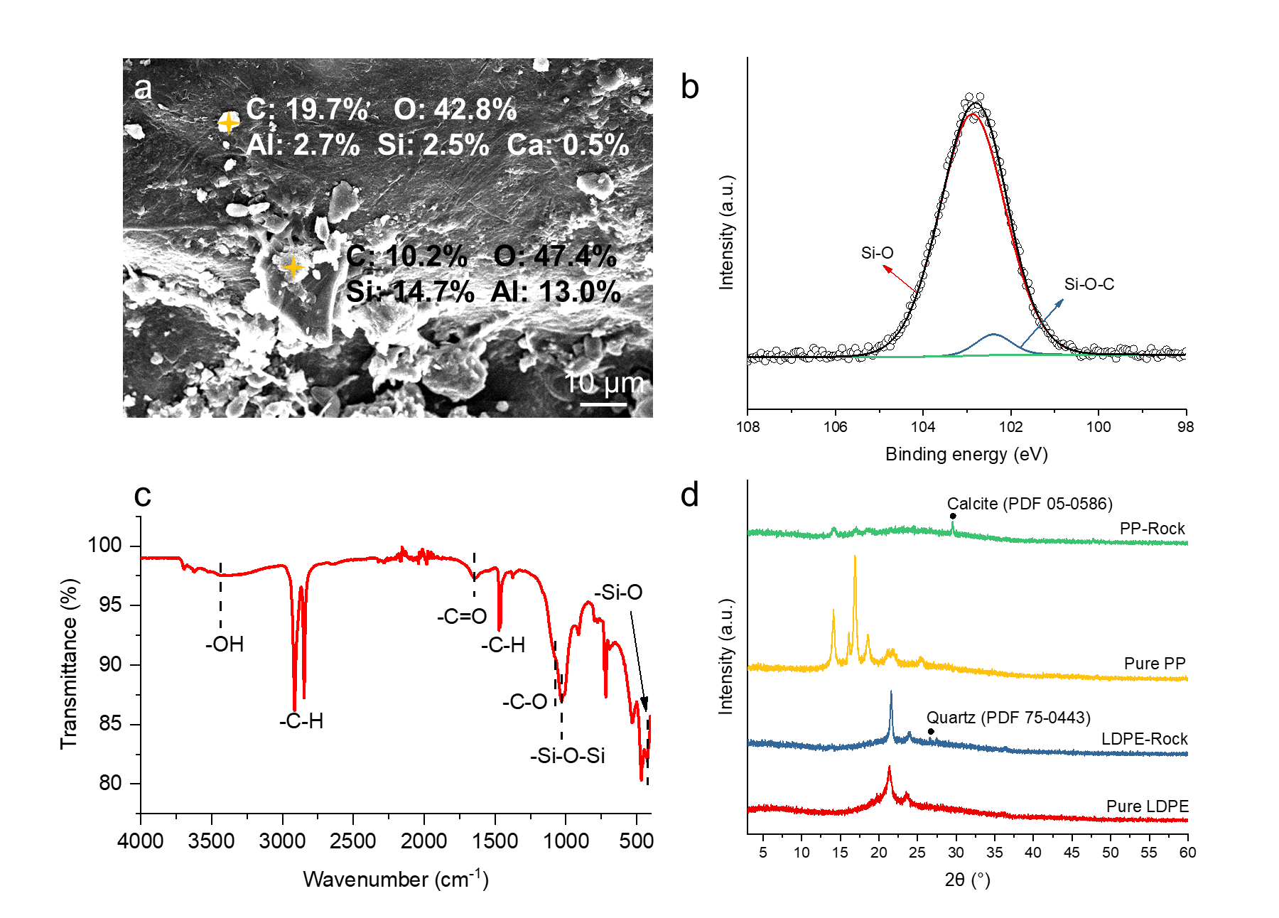 多个证据显示,LDPE塑料与岩石发生不可逆的化学结合:1)SEM-EDS图谱显示出代表塑料与岩石的元素发生交叠;2)XPS Si 2p图谱出现了Si-O-C化学键的特征峰;3)FTIR图谱呈现出含有Si-O的吸收峰;4)XRD图谱出现代表石英的衍射峰(图3)。针对PP薄膜,XPS Si 2p图谱中并未出现产生化学键的证据,预示其主要通过物理作用而不是化学键附着于岩石之上。