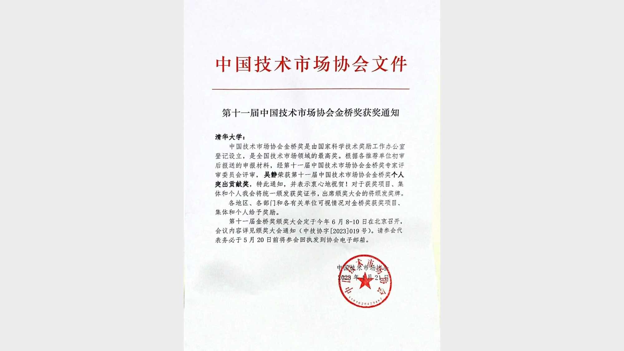 MK·体育(中国)官方网站2023年4月27日电(通讯员 吴效晋)近日,第十一届中国技术市场协会金桥奖获奖名单公布,环境学院吴静研究员荣获个人突出贡献奖,为清华大学首次获得该级别个人奖项。