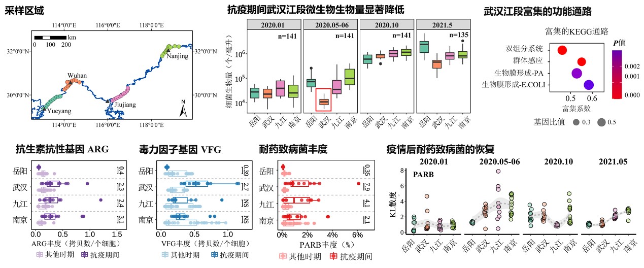 疫情期间,大量抗疫药品和消毒剂被用来应对新冠病毒的环境传播和新冠患者的治疗,这些药品和化学品残留通过污水处理厂出水等形式进入地表水体当中,可能对水体环境造成次生风险。为了探究这些化学品及其副产物对水体生态系统的影响,研究团队于2020年1月(武汉疫情前)、2020年5-6月、2020年10月和2021年5月(武汉疫情后)于长江干流武汉江段及其上游岳阳、下游九江和南京江段采集表层水样。研究结果发现,在疫情防控期间,长江干流武汉江段检测出余氯,浮游微生物细胞密度显著下降。线性混合模型和中性理论模型拟合表明,疫情期间武汉江段微生物细胞密度的下降主要受到疫情的影响。相应地,长江干流武汉江段原核生物和真核生物群落的组成和功能相比于上下游发生了明显的变化,体现为耐氯生物的丰度显著提高。与其他时期相比,疫情期间长江干流武汉江段抗生素耐药基因、毒力因子基因和同时含有这两种基因潜在耐药致病菌的丰度显著提高,分别增加了2.3、2.7和7.9倍。在武汉疫情后,长江干流武汉江段浮游生物群落组成和功能性状均恢复正常。