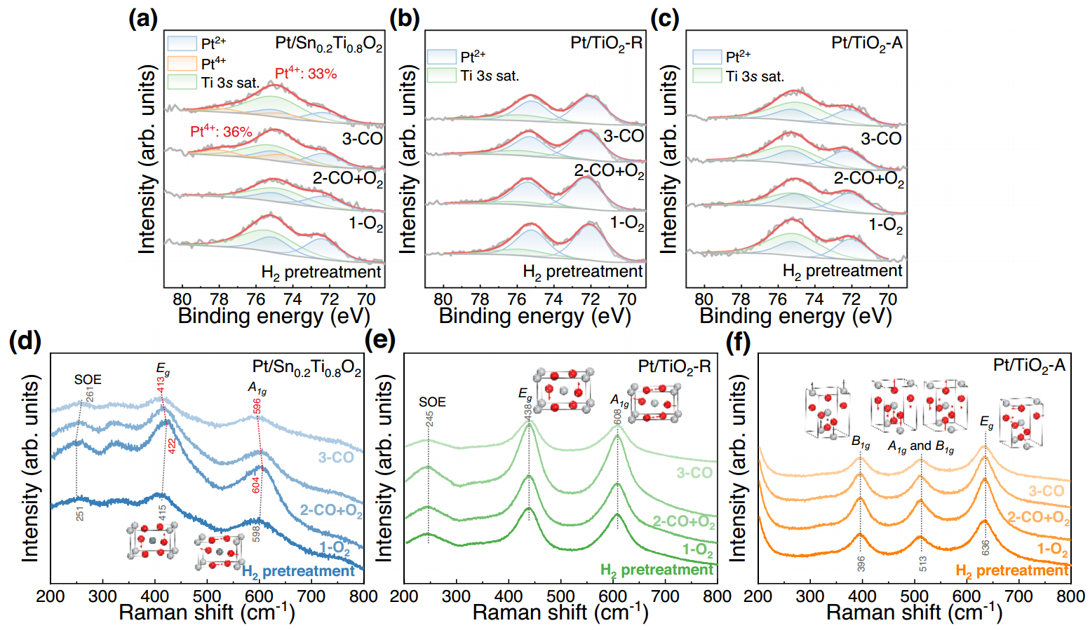 在整个原位NAP-XPS研究中,没有检测到金属Pt物种的峰。经H2预处理后,均只观察到Pt2+,进一步O2处理后,未观察到Pt4+。然而,Pt/Sn0.2Ti0.8O2引入CO + O2会生成Pt4+物种,且Pt4+仅在通入CO时存在。Pt/TiO2-R和Pt/TiO2-A催化剂不存在上述现象。此外,Pt/Sn0.2Ti0.8O2表面Pt2+氧化为Pt4+和CO氧化同时发生,表明晶格氧先转移到Pt位点上,然后再将CO氧化为CO2,即发生了氧逆溢流现象。原位拉曼光谱中的所有峰均为Ti-O的振动,其中只有Pt/Sn0.2Ti0.8O2催化剂在的原位拉曼光谱峰发生了偏移,表明载体中的O配位环境发生改变,侧面证明了氧逆溢流的发生。