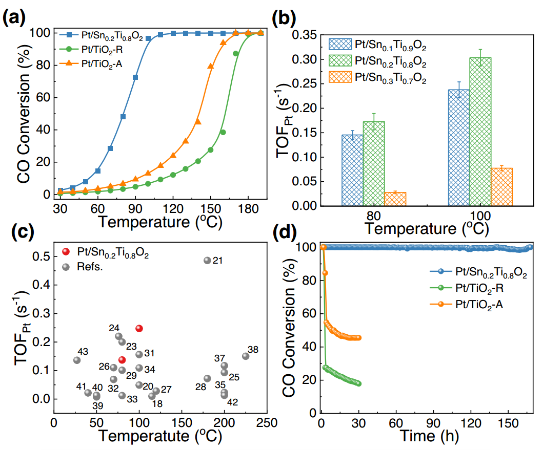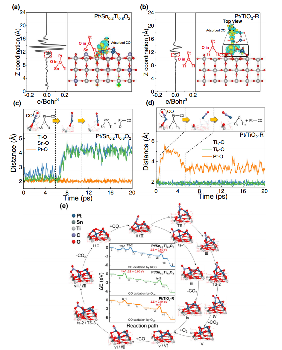 氧物种的溢流过程在氧化还原反应中至关重要,但与氢溢流相比,氧溢流的机制尚不清晰。该项研究针对尾气中的低浓度CO污染物,探究了Pt/TiO2催化剂氧化CO的反应过程。研究结果显示,将Sn掺杂到载体TiO2后激活了低温(<100°C)下Pt/TiO2催化剂中的氧逆溢流过程,显著提升了Pt/TiO2催化剂的CO氧化活性。结合近常压X射线光电子能谱技术(XPS)、原位拉曼/红外光谱和从头算分子动力学模拟,揭示了氧逆溢流过程是由CO在Pt2+位点的吸附引发的Sn-O-Ti键断裂,随后O迁移至活性位点导致Pt4+的生成。